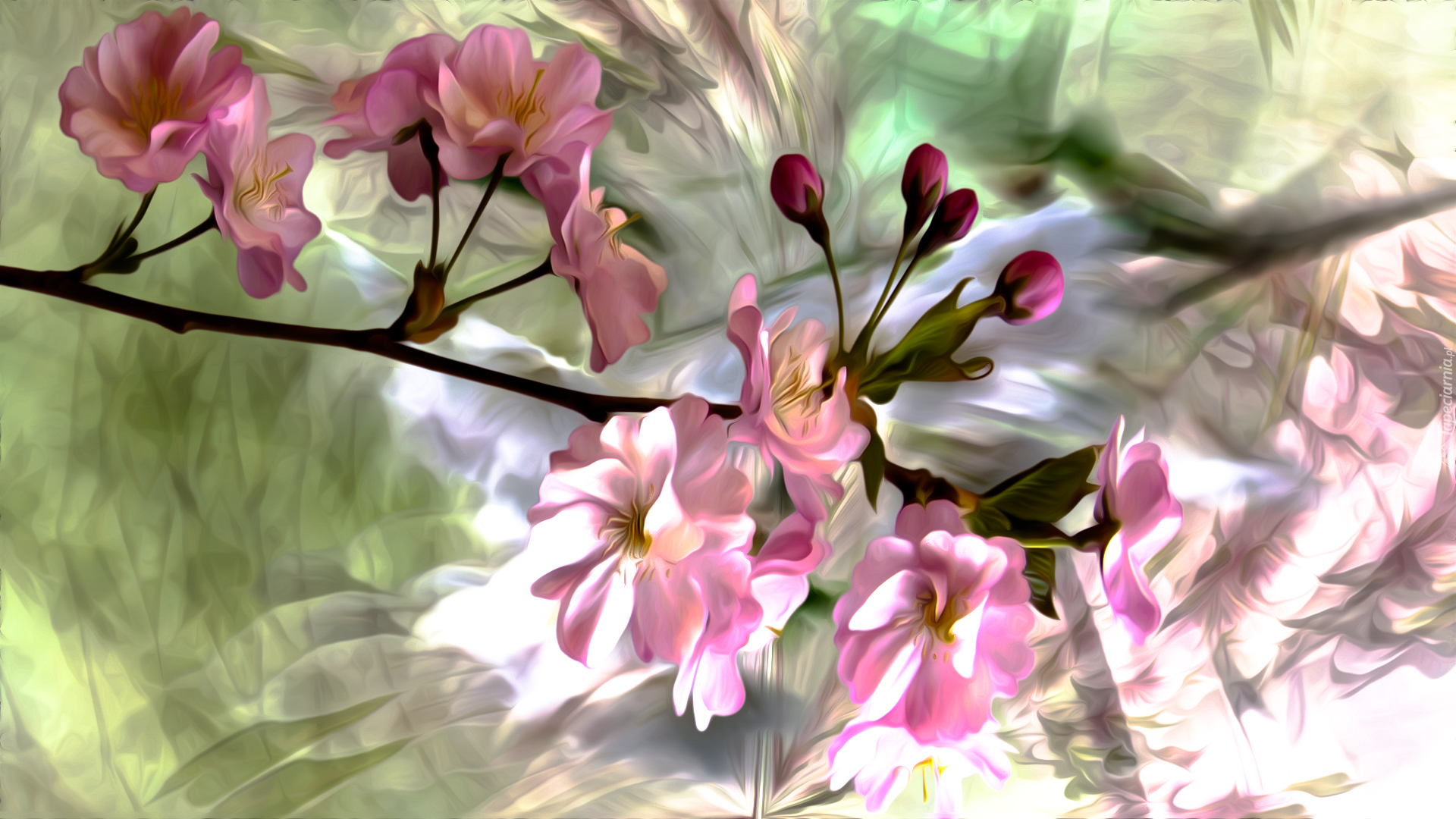 Edytor tapety: Gałązka z różowymi kwiatami w grafice
