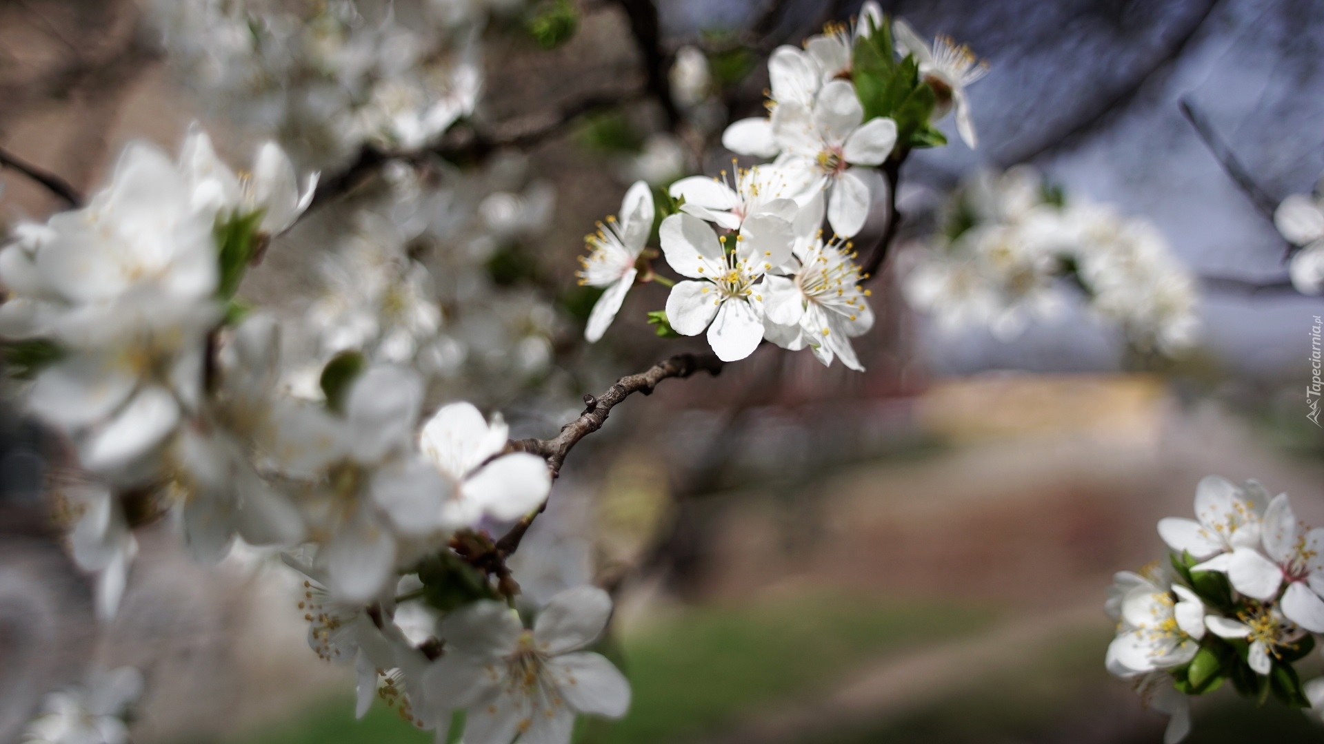 Edytor tapety: Białe kwiatki na gałązkach w rozmyciu