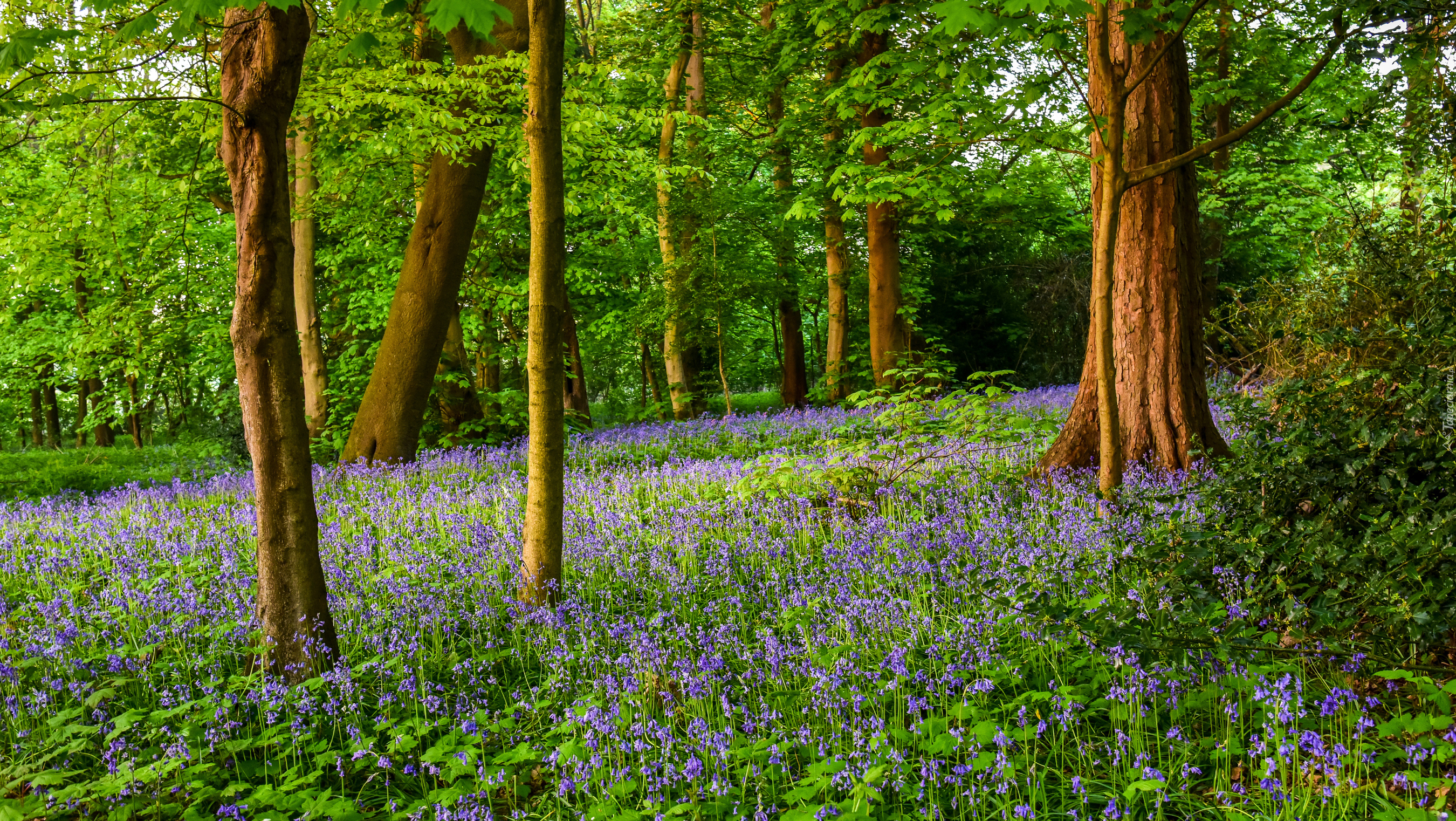 Edytor tapety: Wiosenne kwiaty między drzewami w lesie