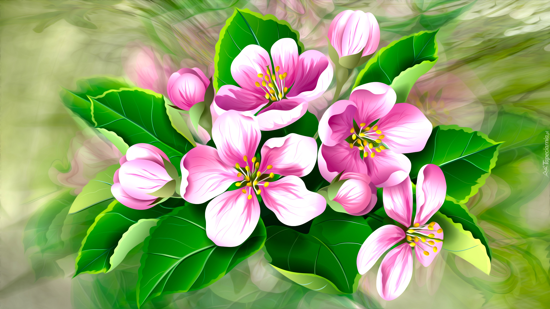 Edytor tapety: Biało-rożowe kwiaty z listkami