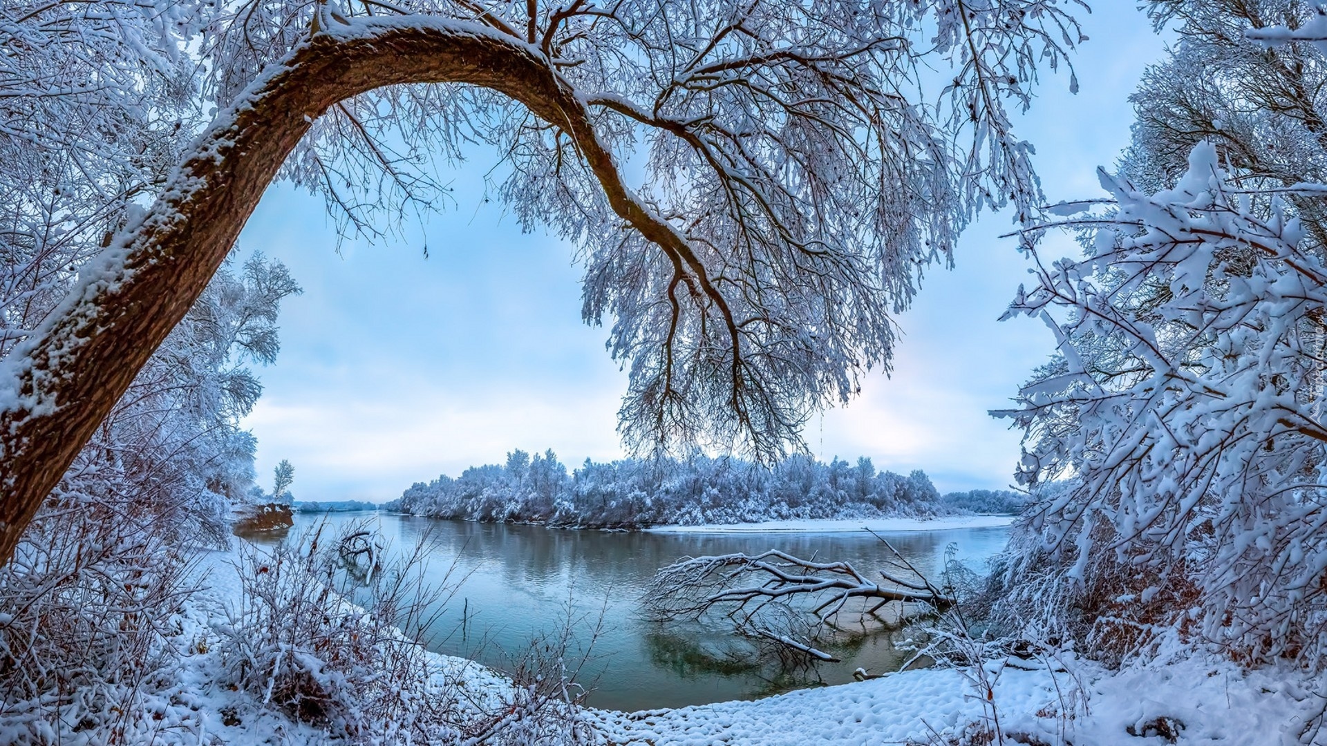 Edytor tapety: Ośnieżone drzewa nad rzeką Terek w Rosji