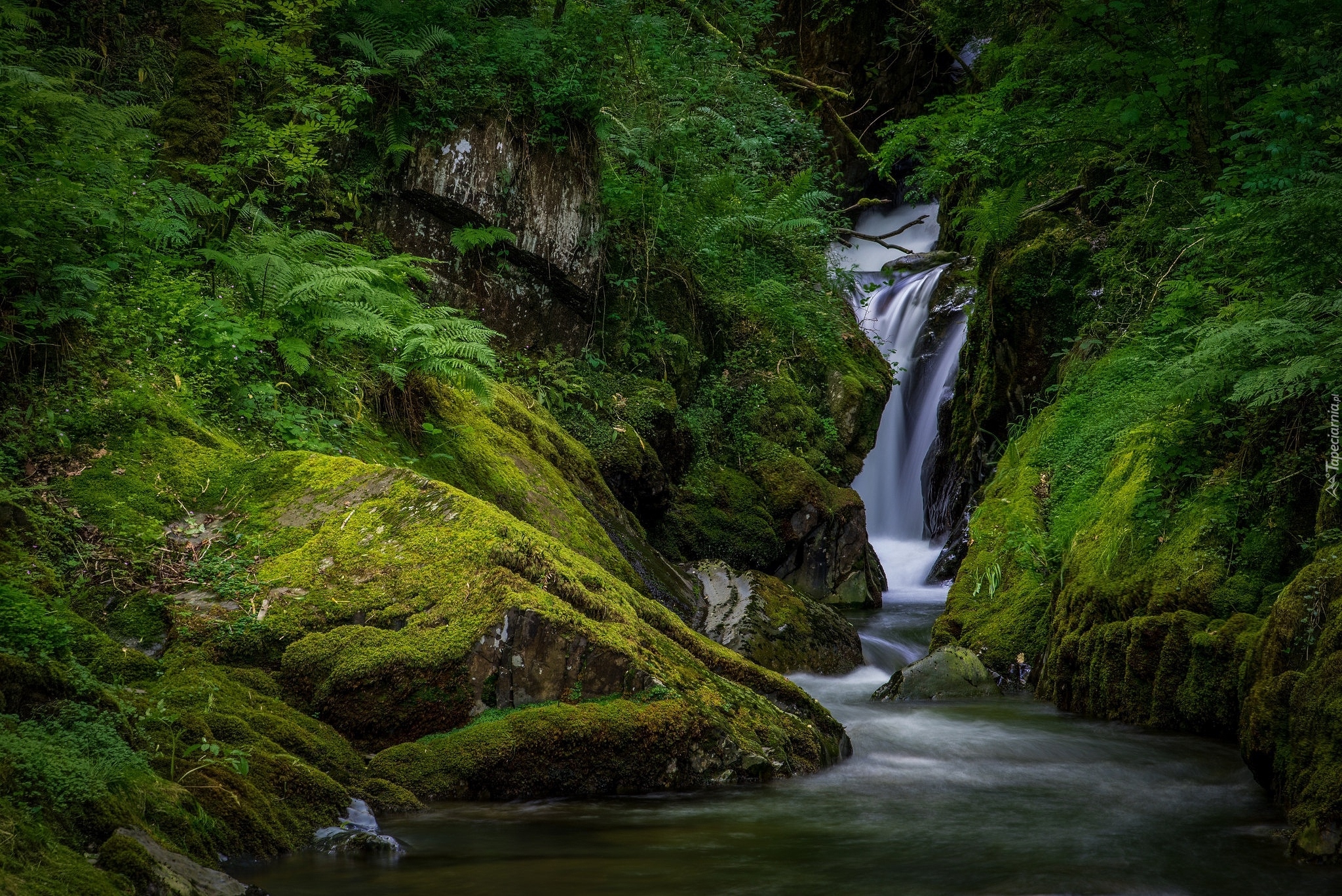 Edytor tapety: Wodospad pomiędzy omszałymi skałami w lesie