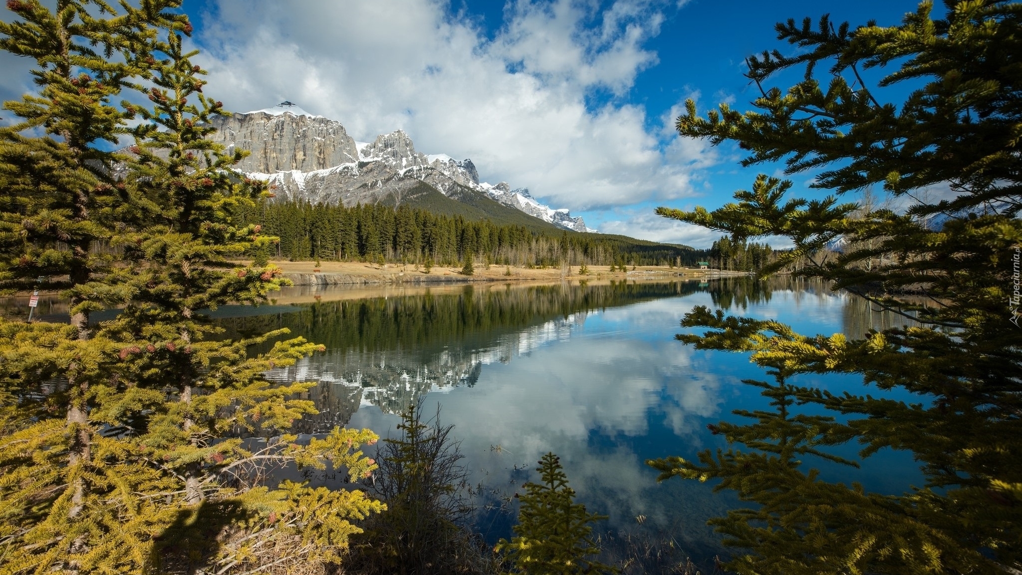 Edytor tapety: Jezioro otoczone drzewami i górami