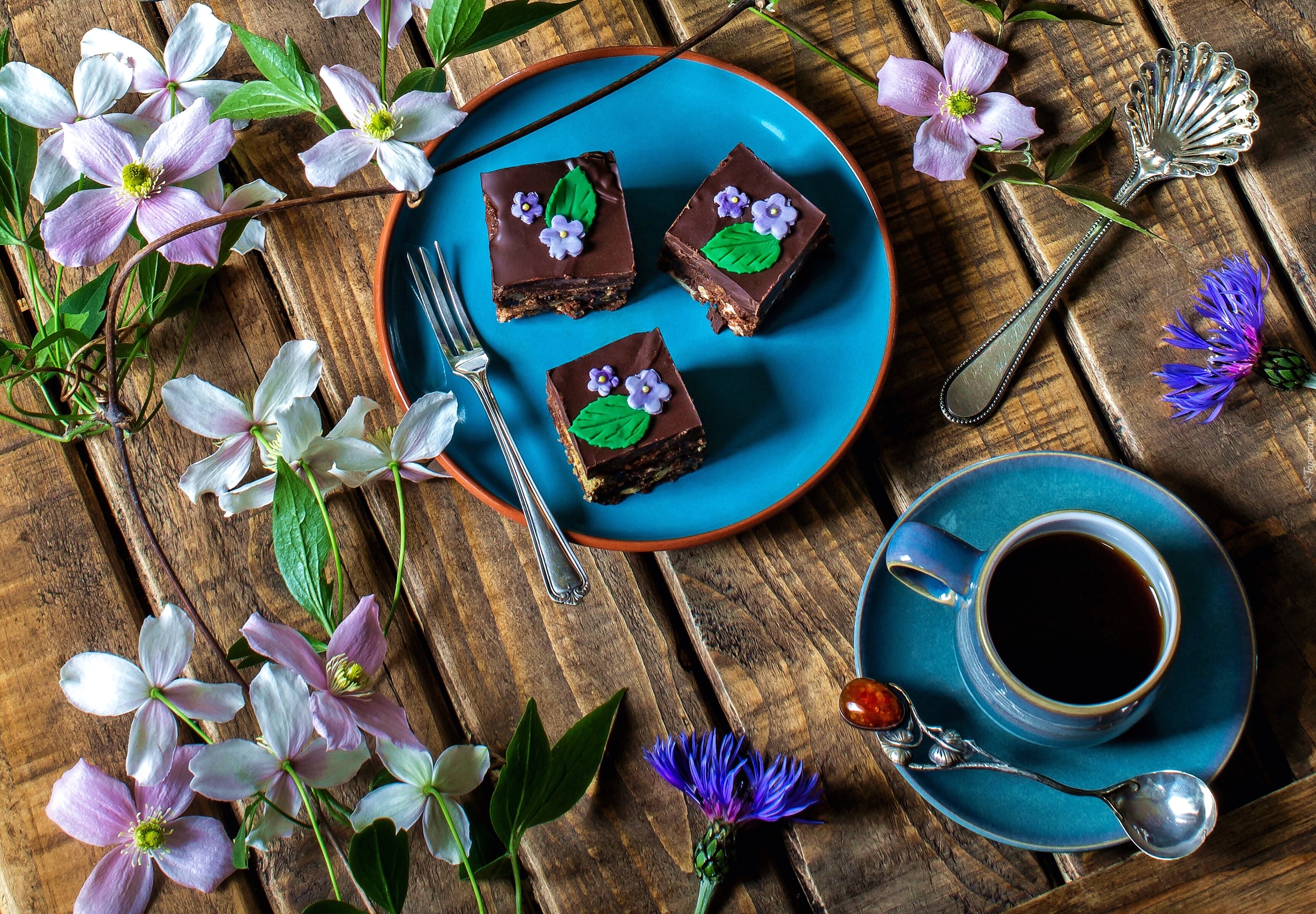 Edytor tapety: Trzy kawałki ciasta i kawa