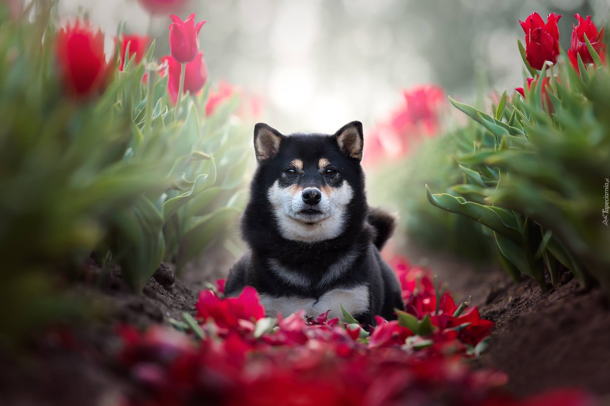 Edytor tapety: Shiba inu pośród tulipanów