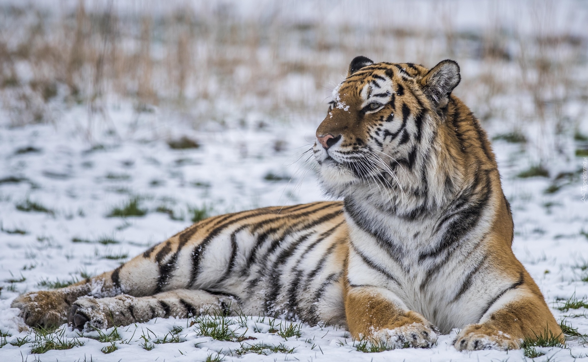 Edytor tapety: Tygrys leżący na śniegu