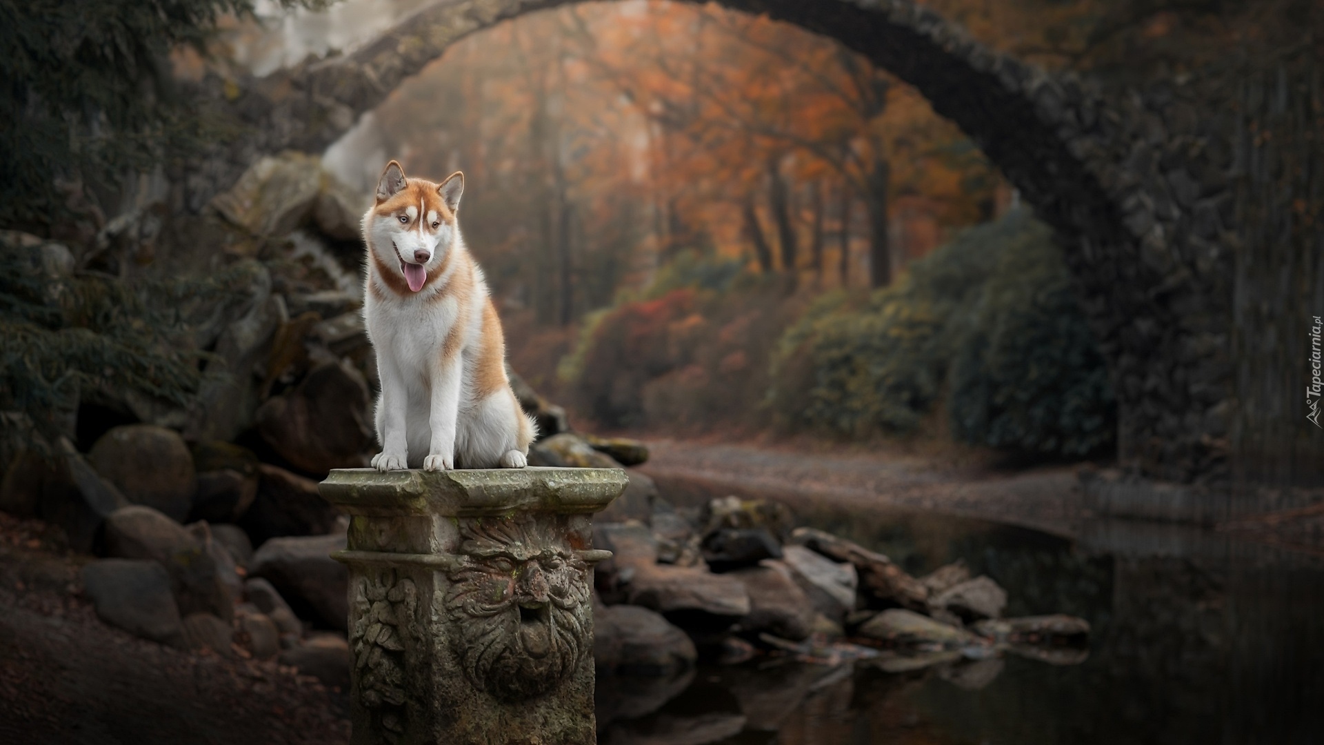 Edytor tapety: Rudo-biały siberian husky na postumencie