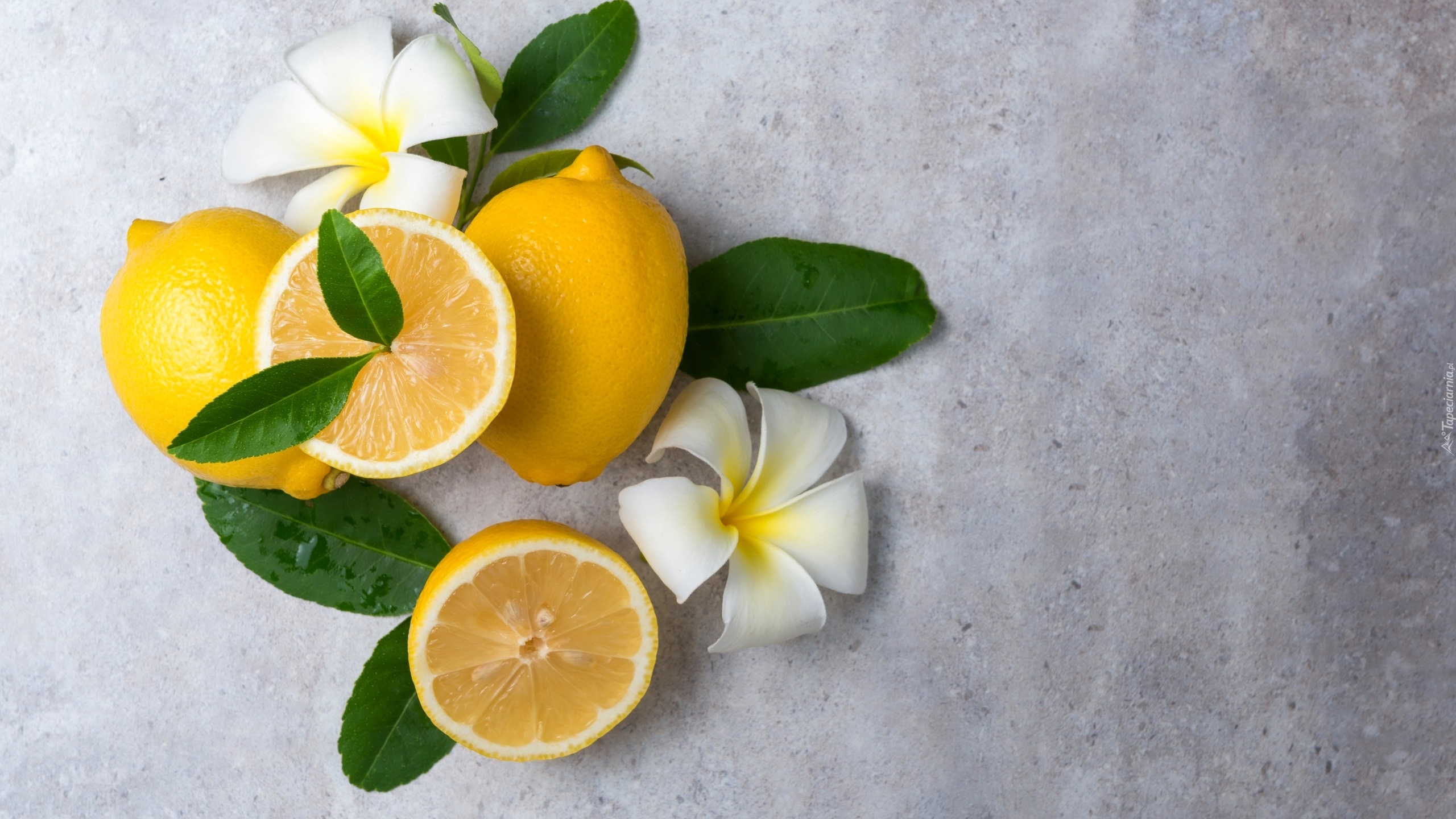 Edytor tapety: Kwiaty plumeri obok cytryn