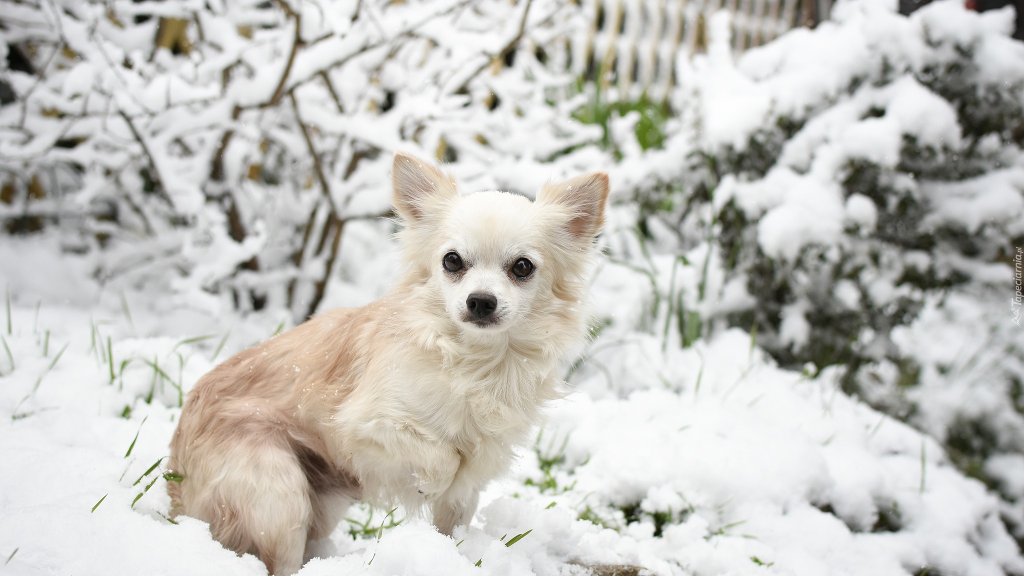 Edytor tapety: Chihuahua długowłosa na śniegu