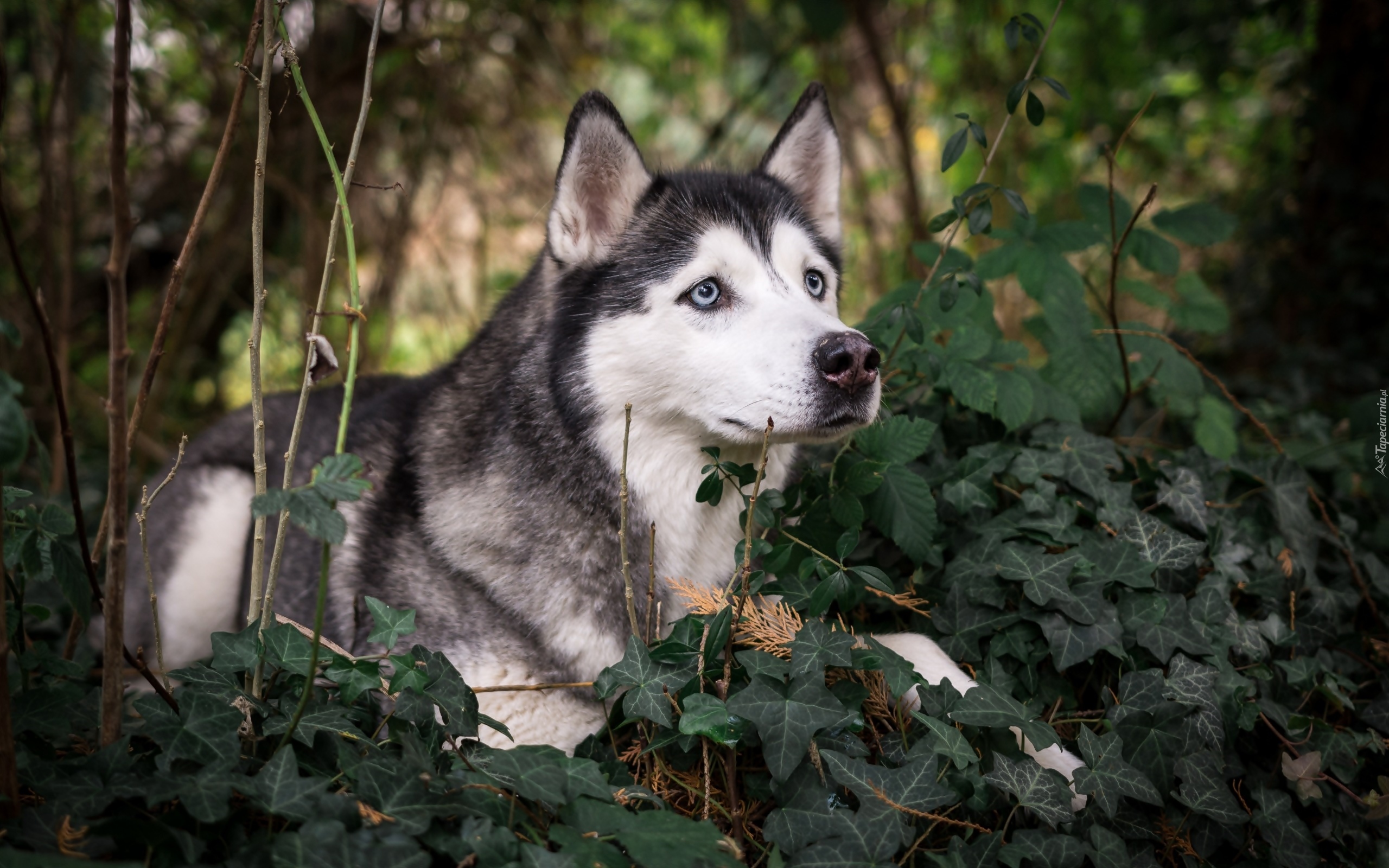 Edytor tapety: Siberian husky w liściach bluszczu