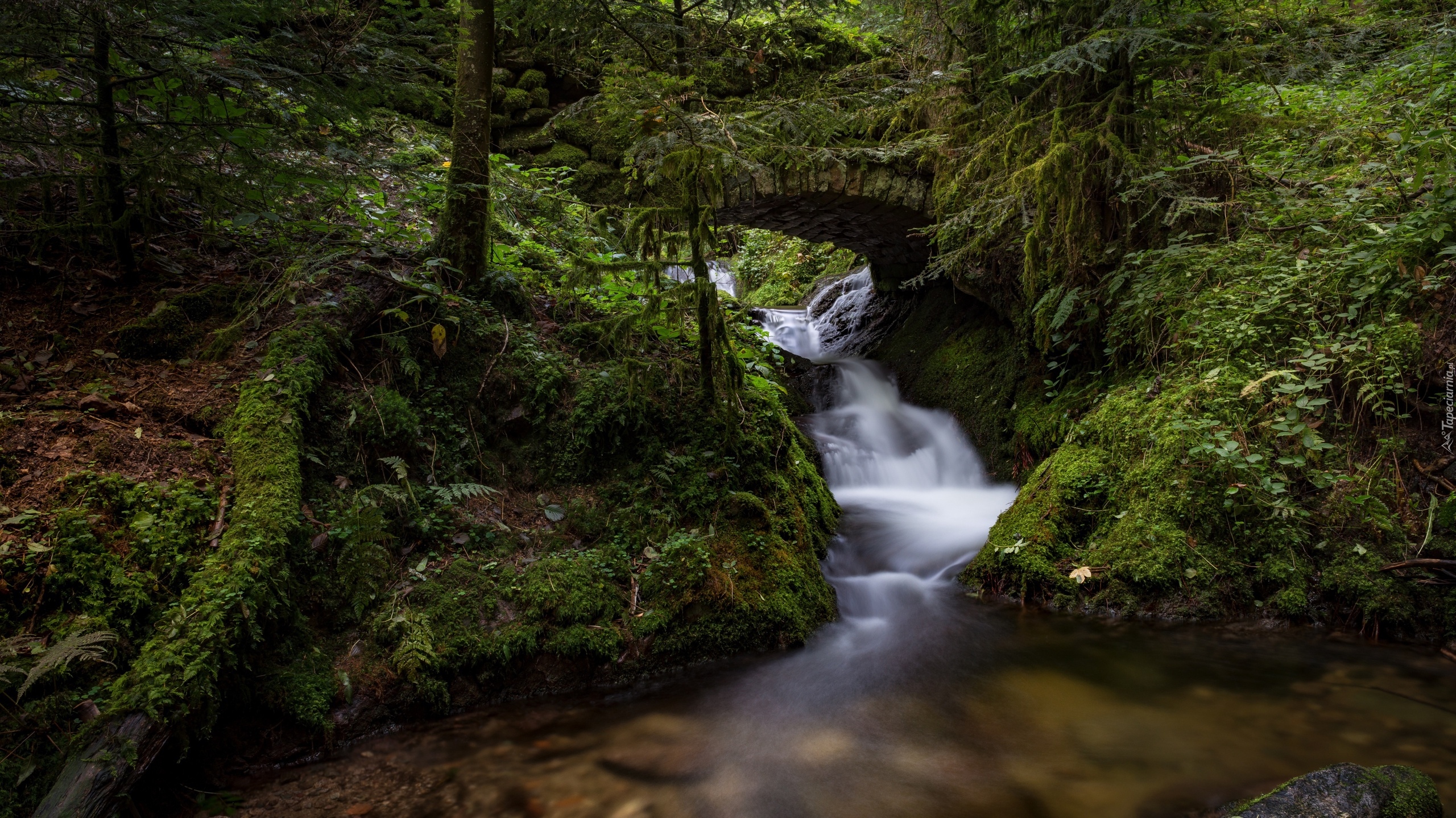 Edytor tapety: Omszały kamienny most nad leśną rzeką