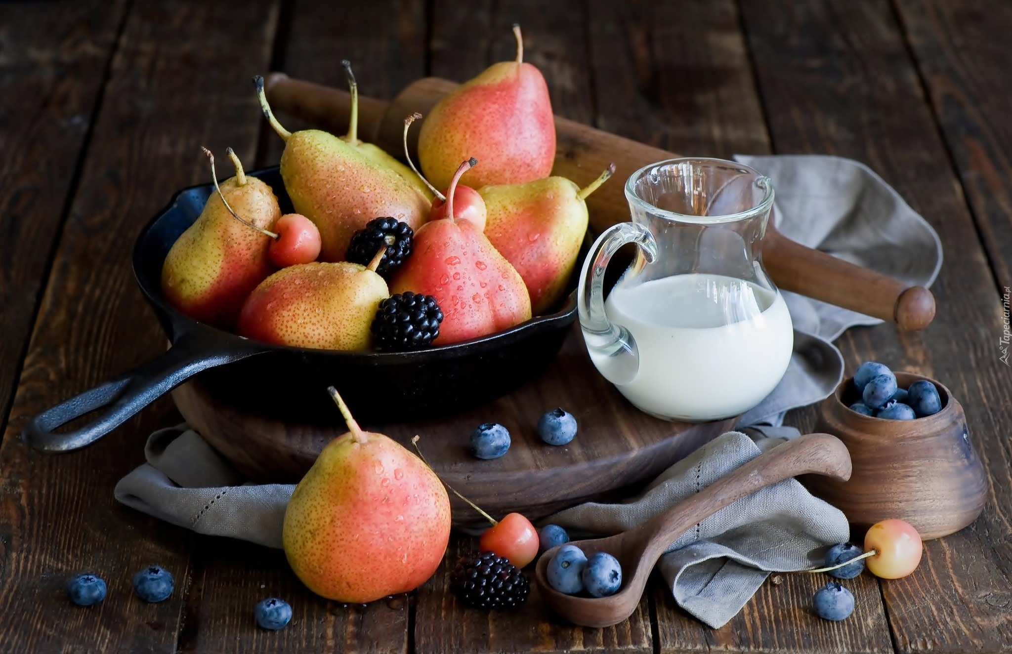 Edytor tapety: Gruszki w kompozycji z dzbanuszkiem mleka