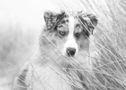Edytor tapety: Owczarek australijski między źdźbłami trawy