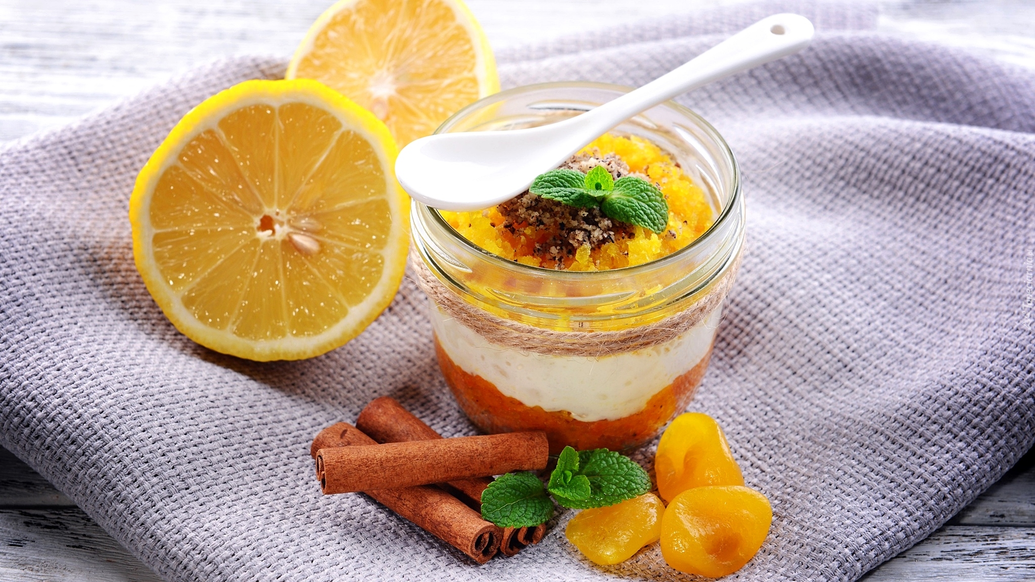 Edytor tapety: Połówki cytryny obok słoiczka z deserem
