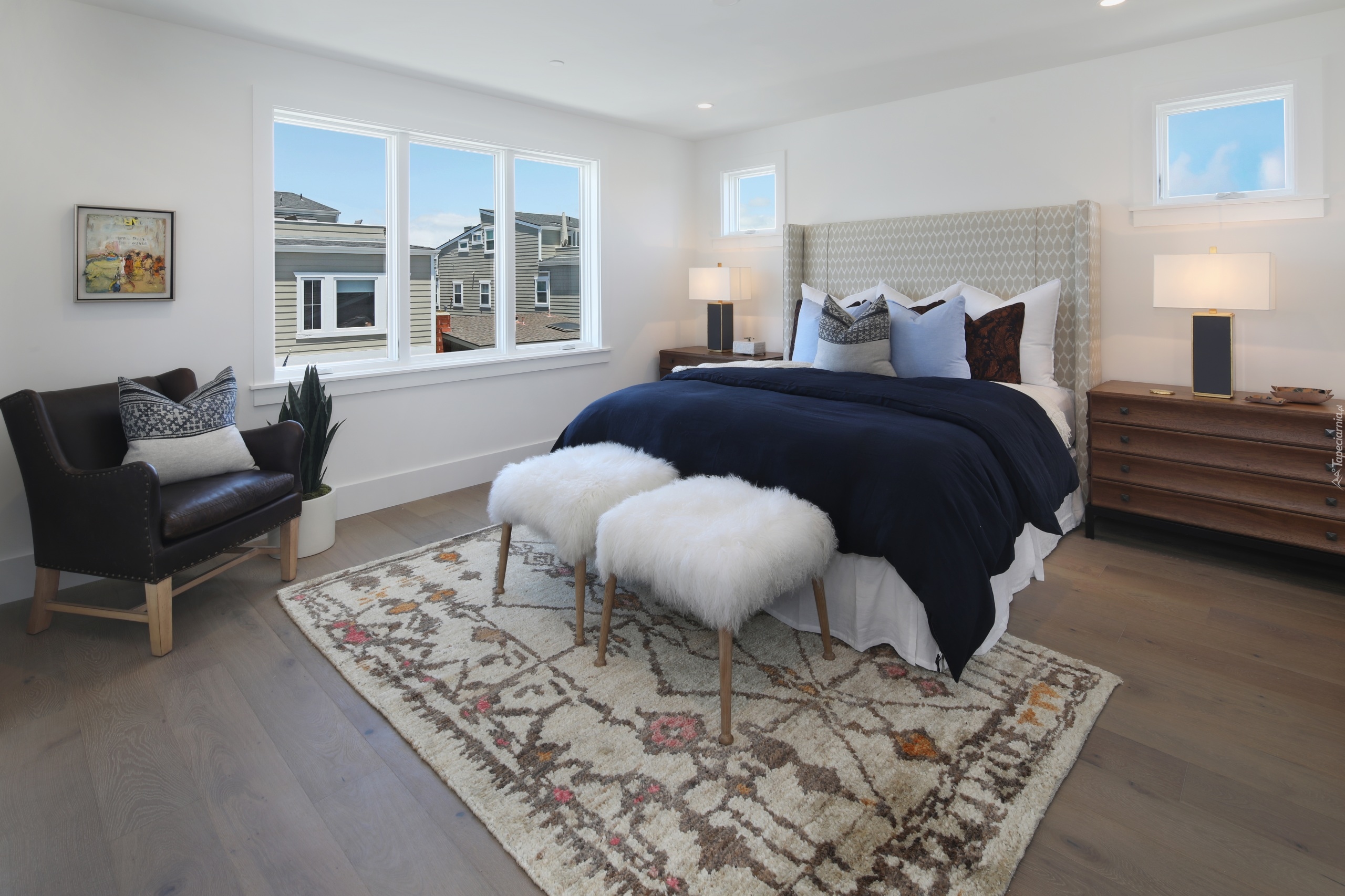 Edytor tapety: Taborety postawione obok łóżka w sypialni