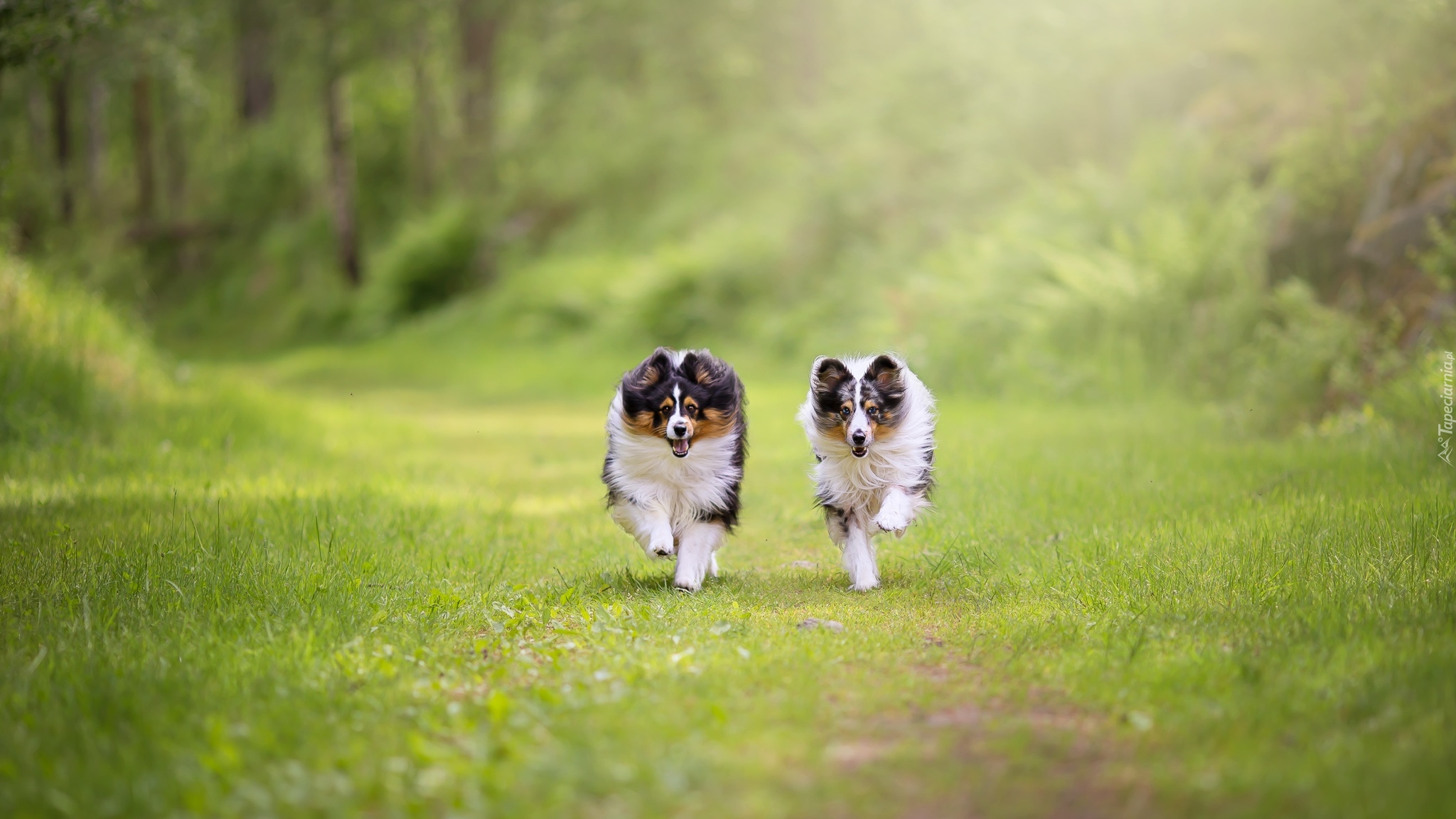 Edytor tapety: Biegnące dwa owczarki szetlandzkie
