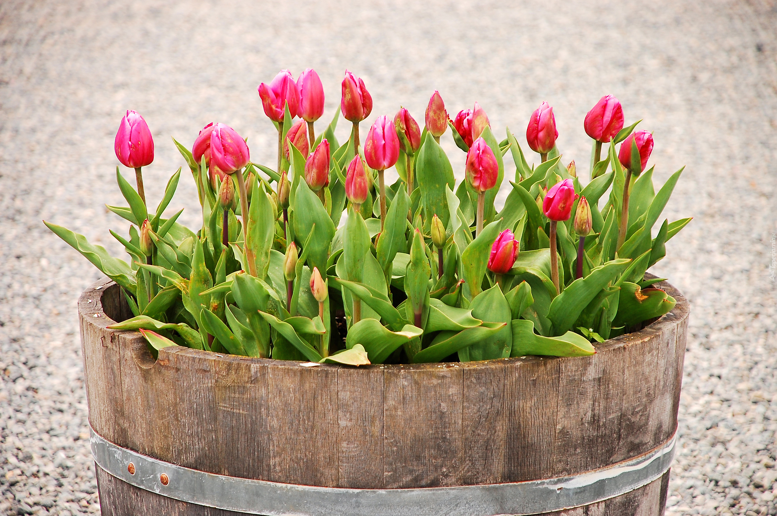 Edytor tapety: Tulipany w drewnianej donicy