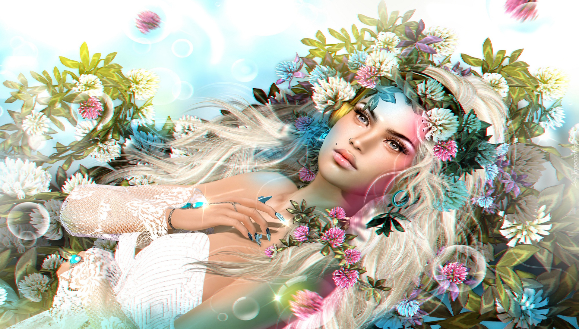 Edytor tapety: Dziewczyna obsypana kwiatami w grafice