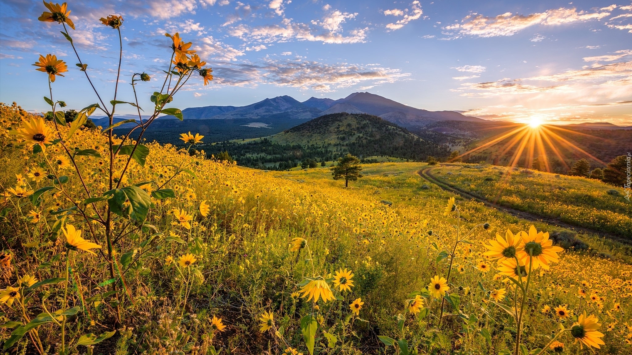 Edytor tapety: Promienie słońca nad ukwieconą łąką