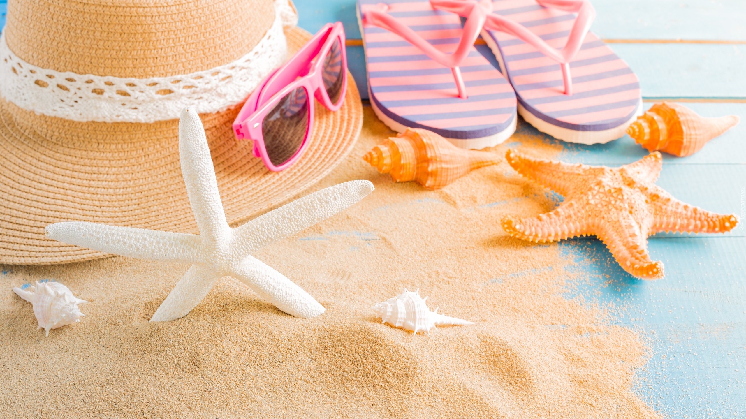 Edytor tapety: Klapki obok kapelusza i muszelek