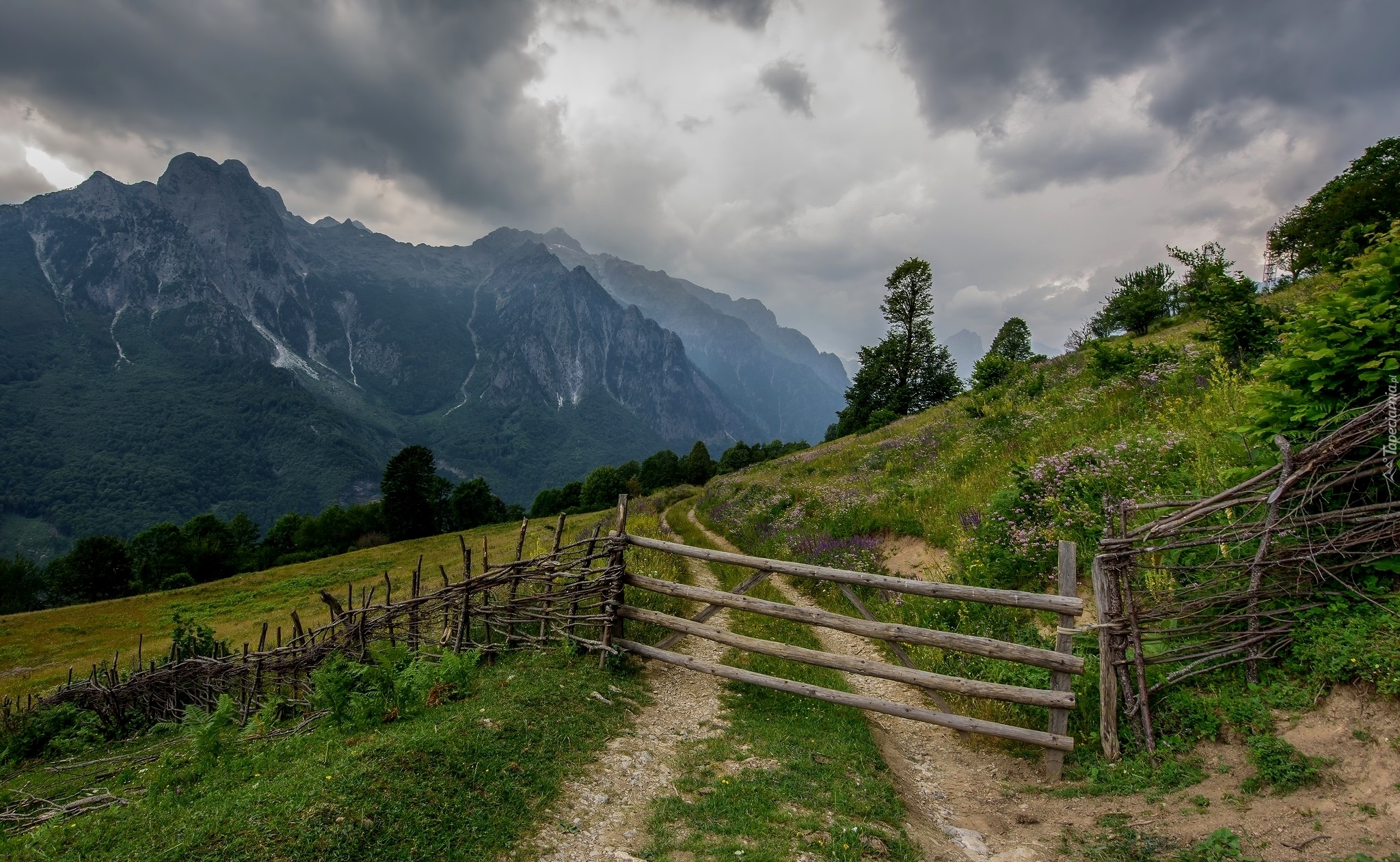 Edytor tapety: Ogrodzenie na drodze prowadzącej w góry