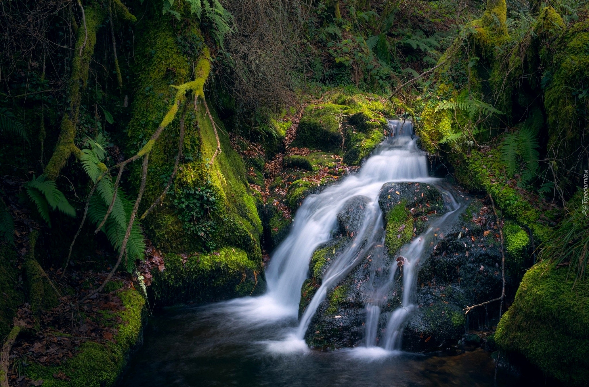 Edytor tapety: Woda spływająca po omszałych kamieniach w lesie