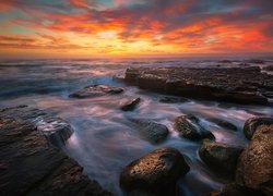 Edytor tapety: Skały i kamienie na brzegu morza o zachodzie słońca