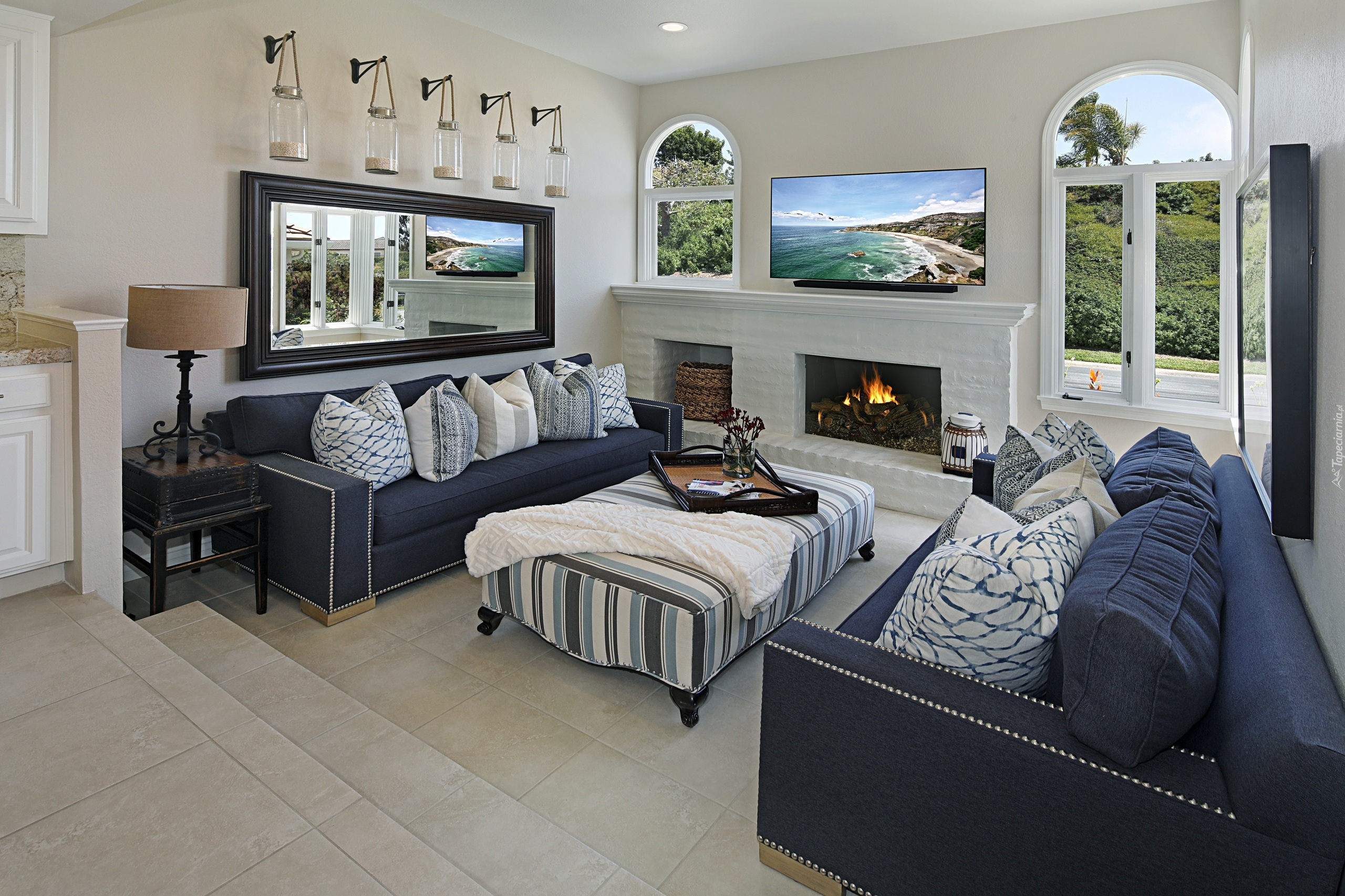 Edytor tapety: Salon z meblami i kominkiem