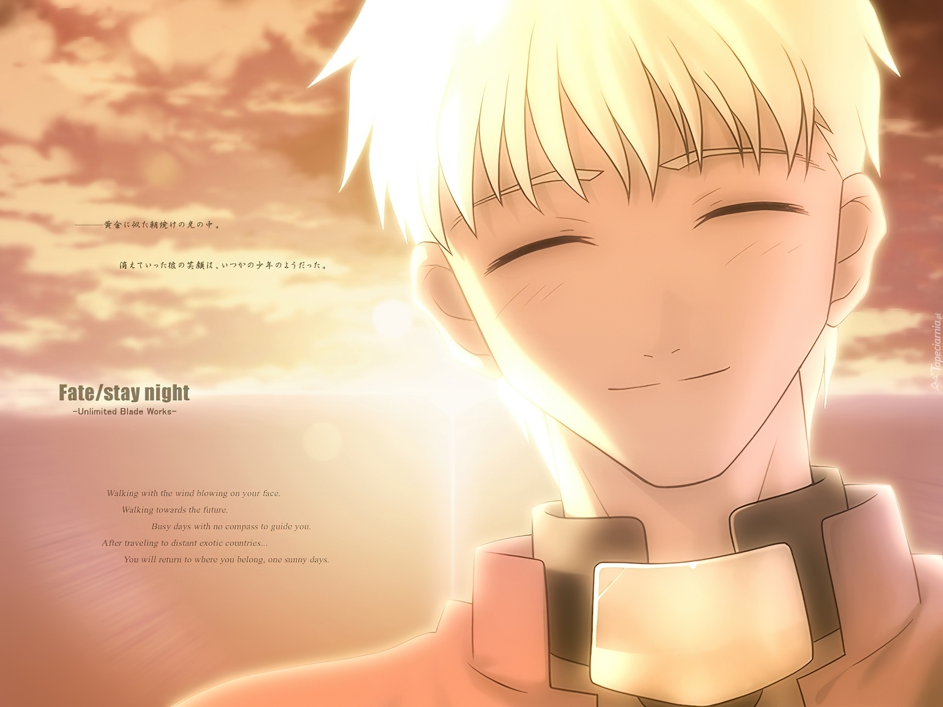 Edytor tapety: Fate Stay Night, zachód słońca, chłopak, woda, napisy