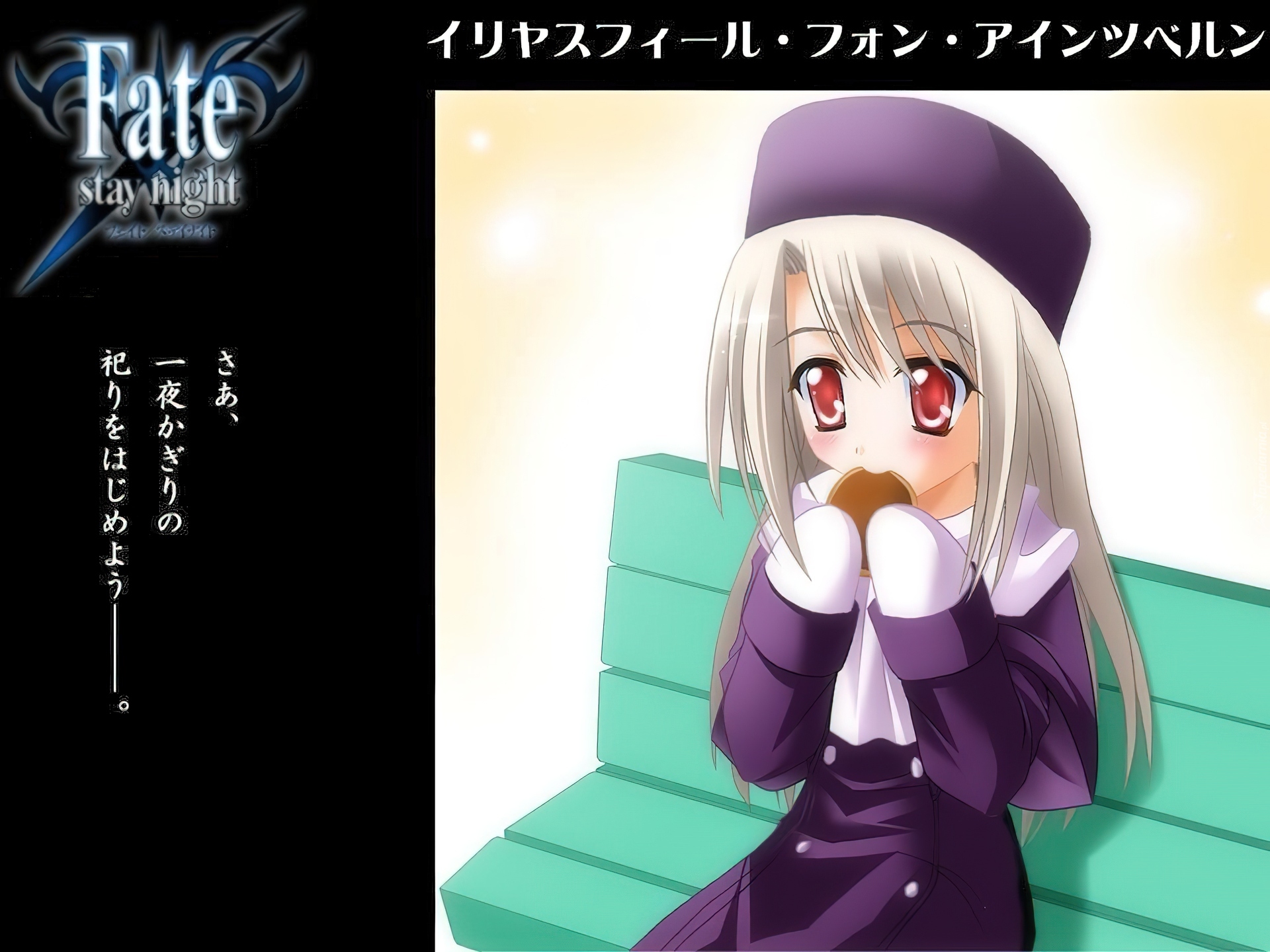 Edytor tapety: Fate Stay Night, napisy, dziewczyna, ciasteczko, ławka