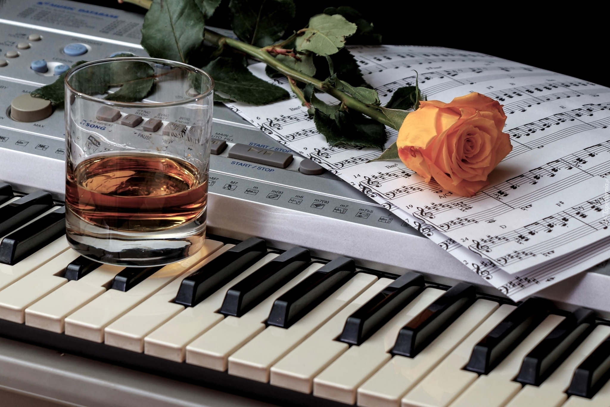 Edytor tapety: Róża i nuty położone obok szklanki na keyboardzie