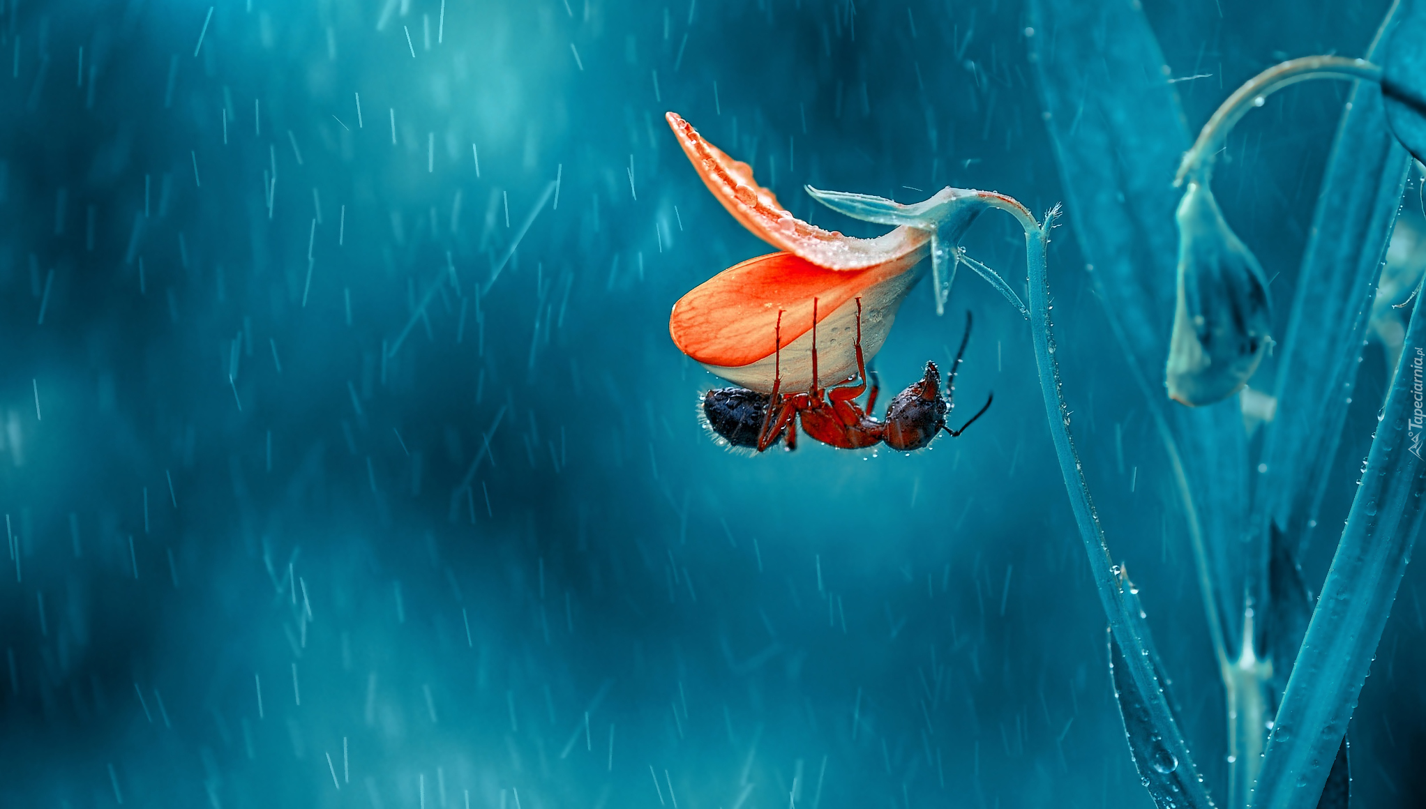Edytor tapety: Mrówka na kwiatku w deszczu