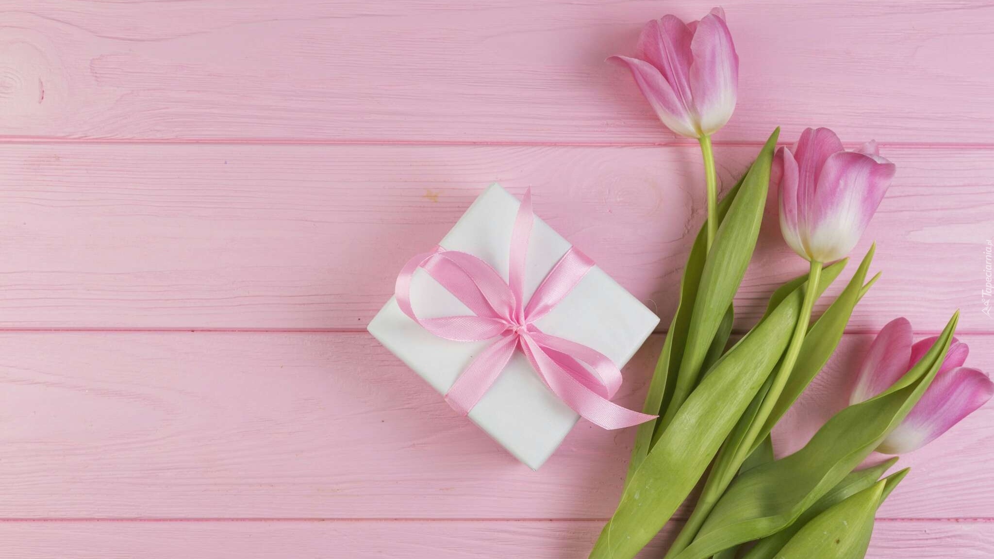 Edytor tapety: Trzy tulipany z prezentem