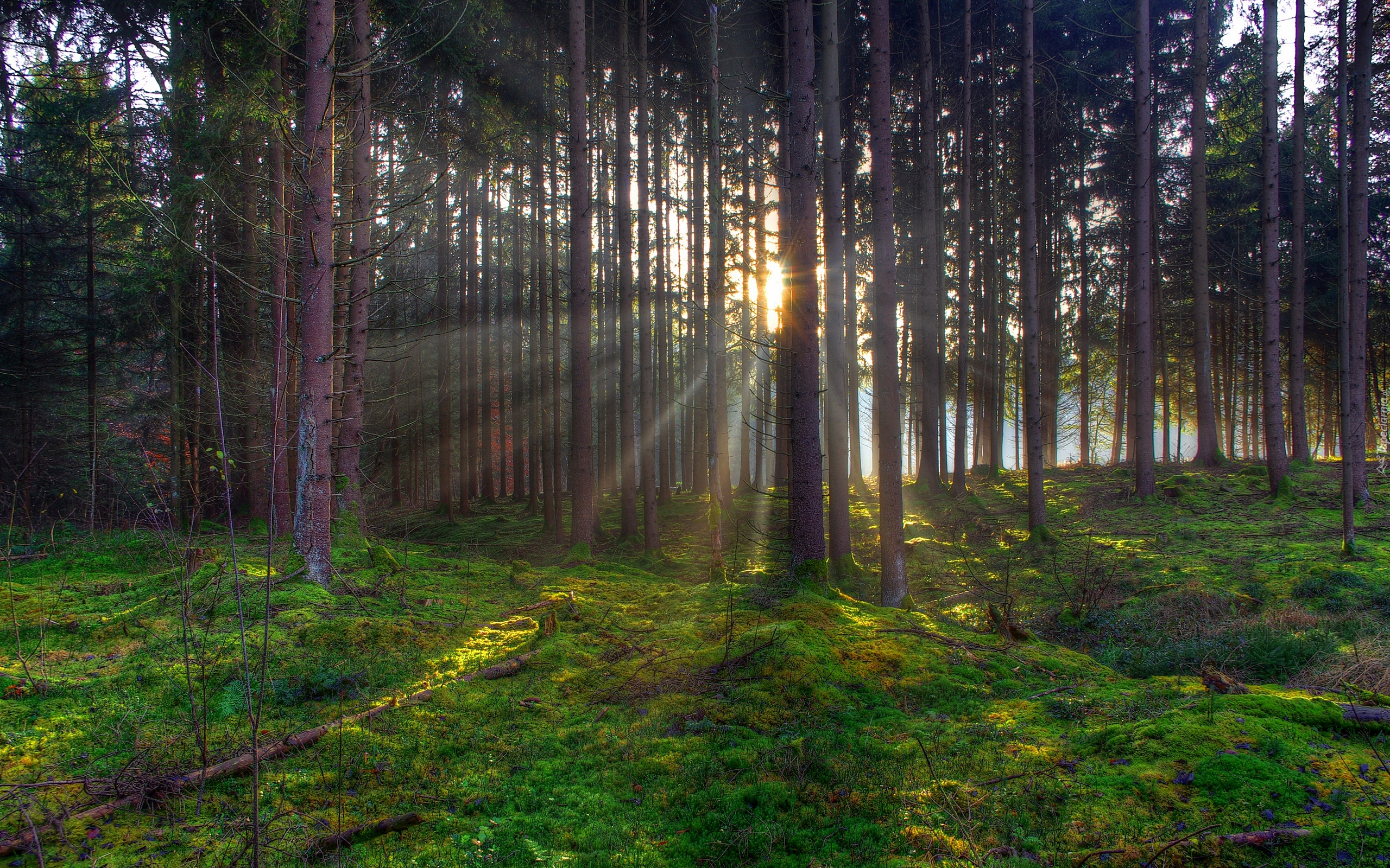 Edytor tapety: Promienie słońca pomiędzy drzewami