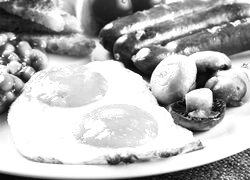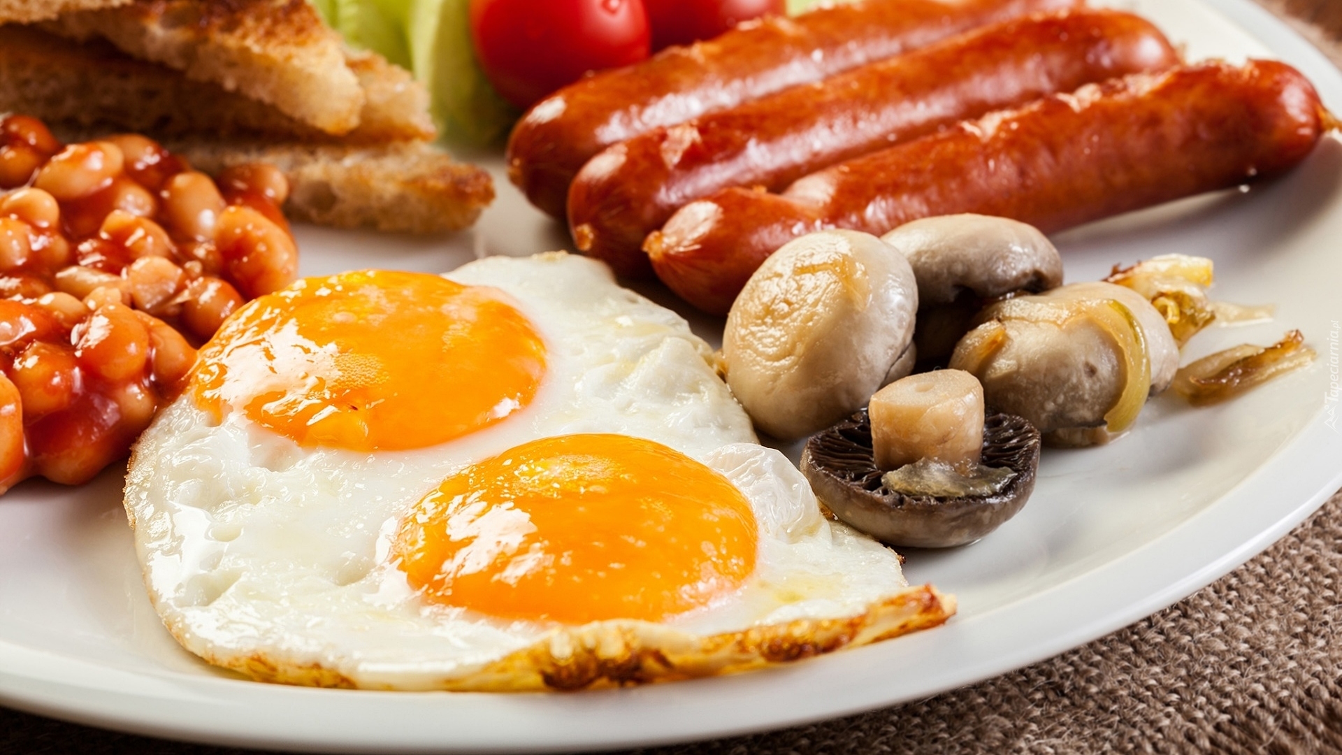 Edytor tapety: Jajka sadzone obok kiełbasy i pieczarek na talerzu