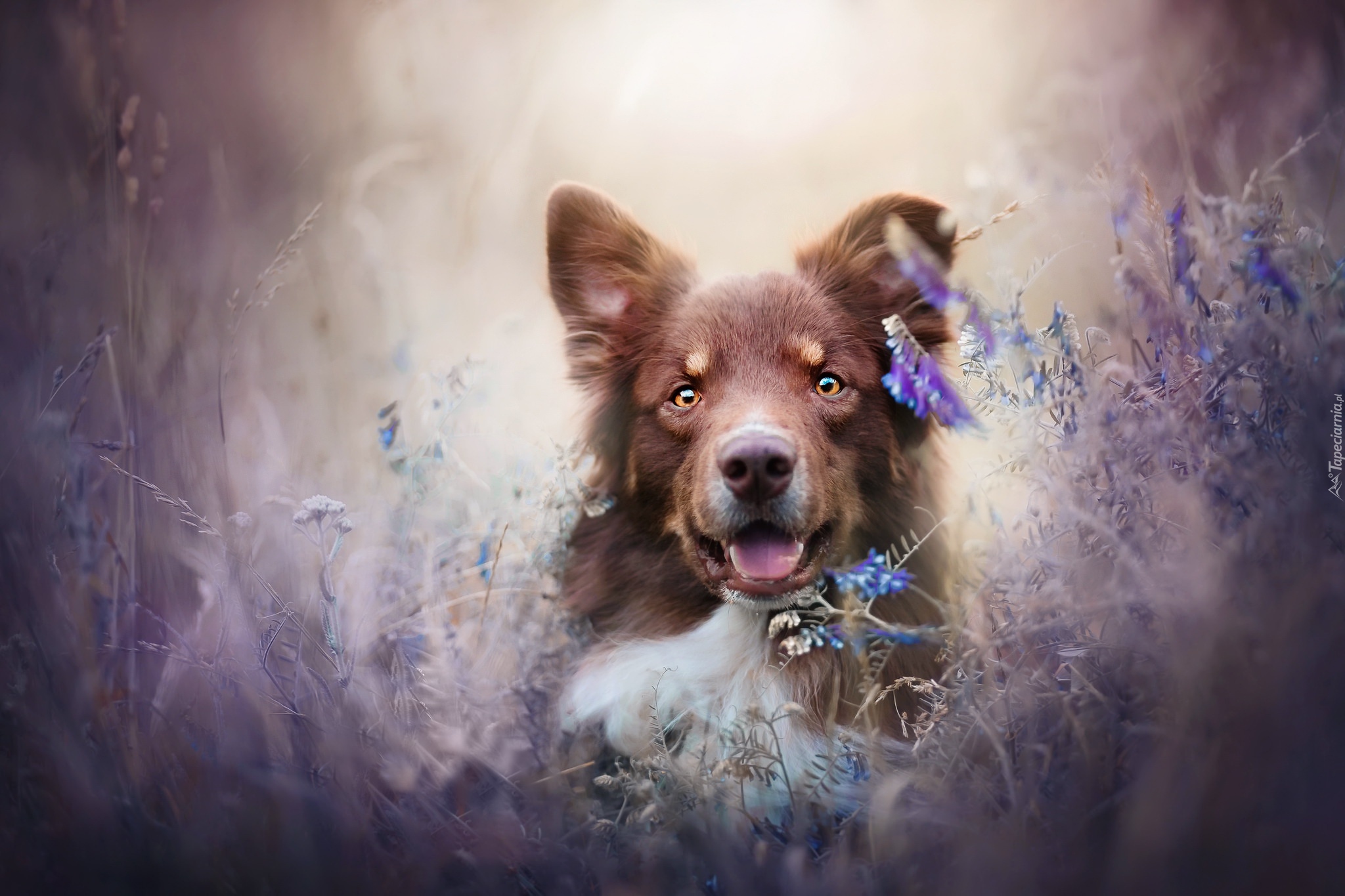 Edytor tapety: Owczarek australijski w kwiatach wyki