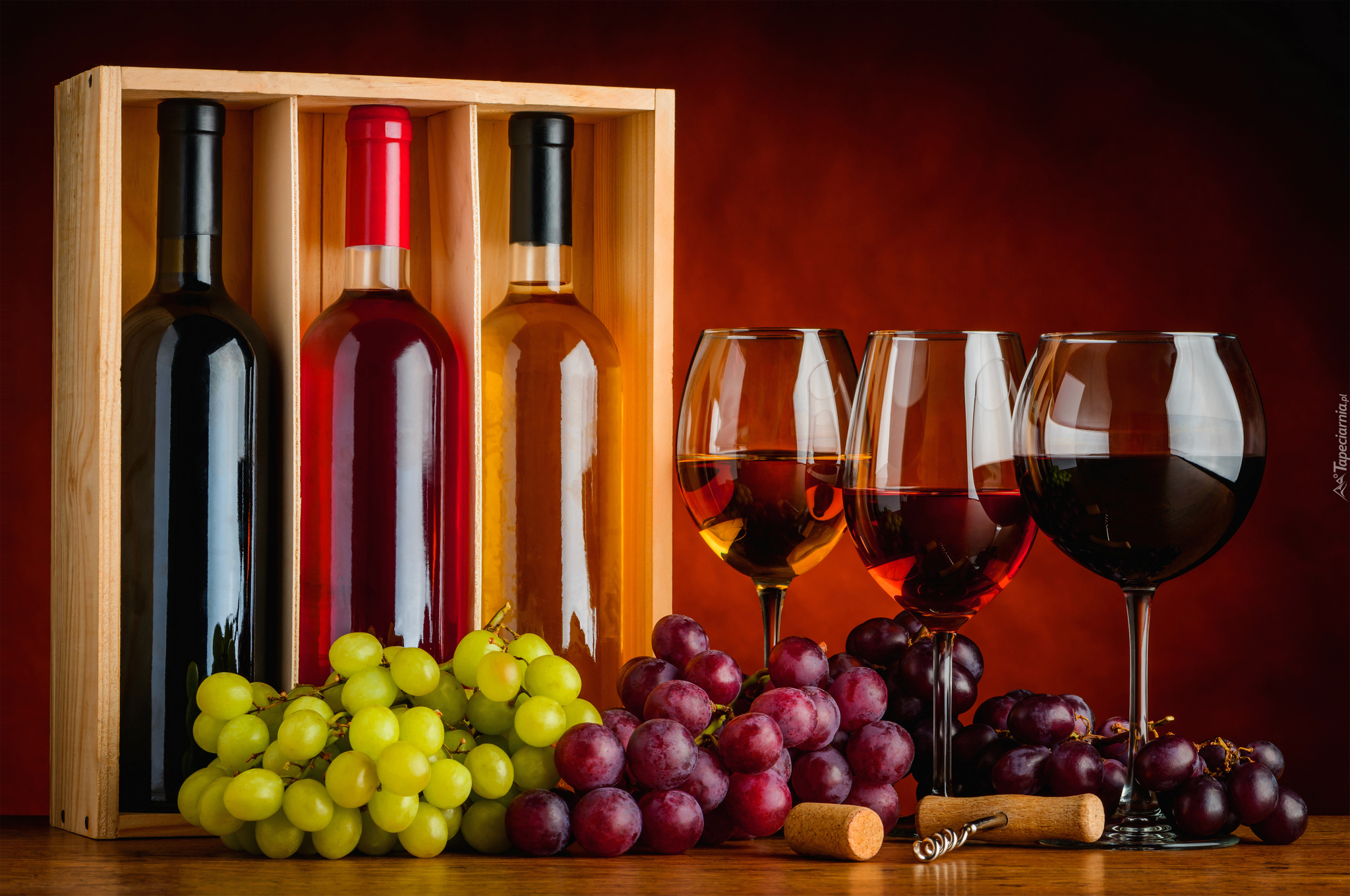 Edytor tapety: Kiście winogron obok butelek i kieliszków z winem