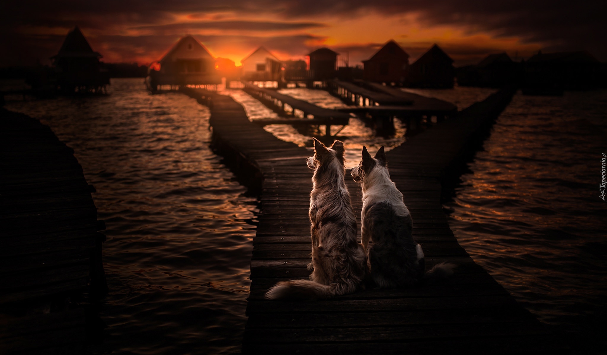 Edytor tapety: Border collie obserwują zachód słońca z pomostu