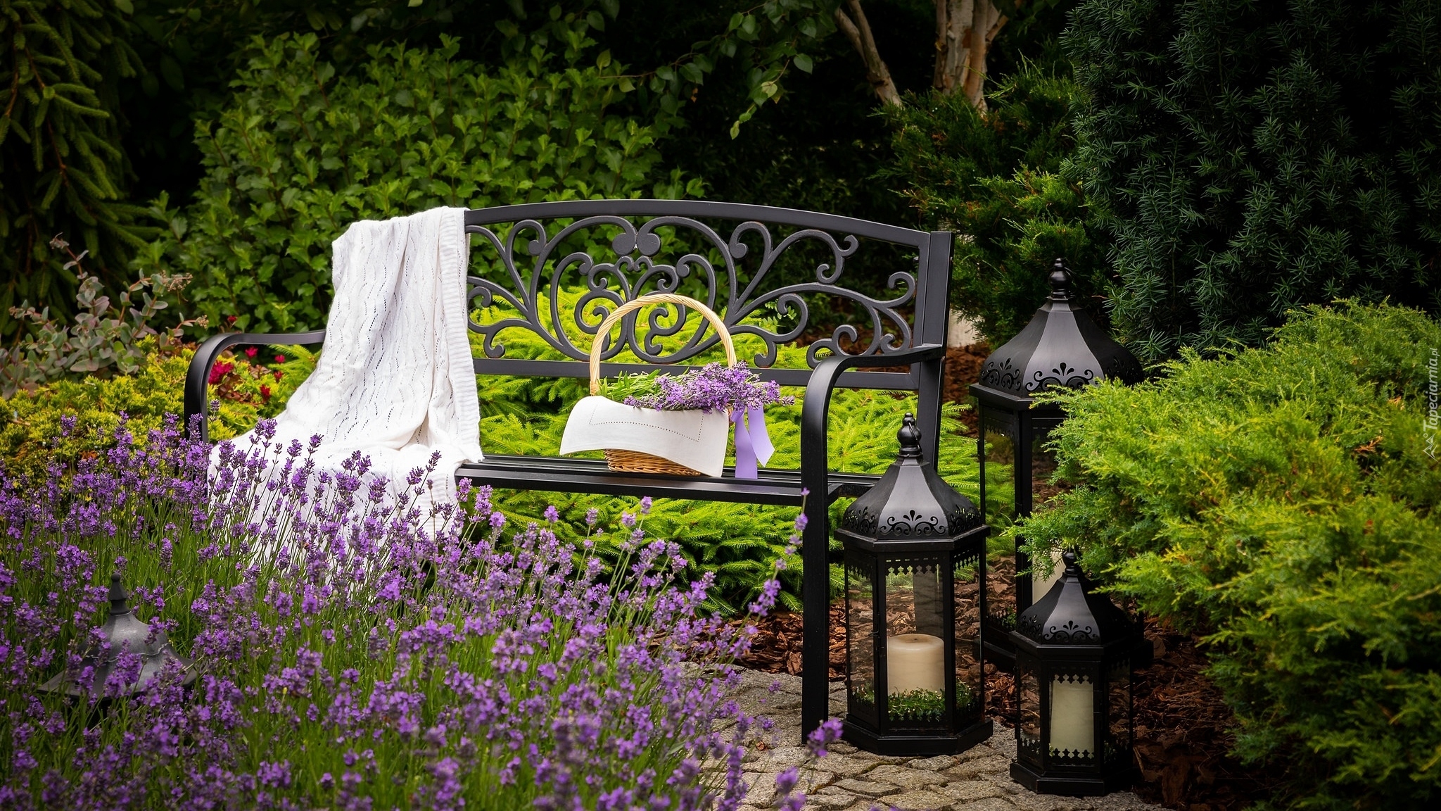 Edytor tapety: Lampiony obok metalowej ławeczki w ogrodzie