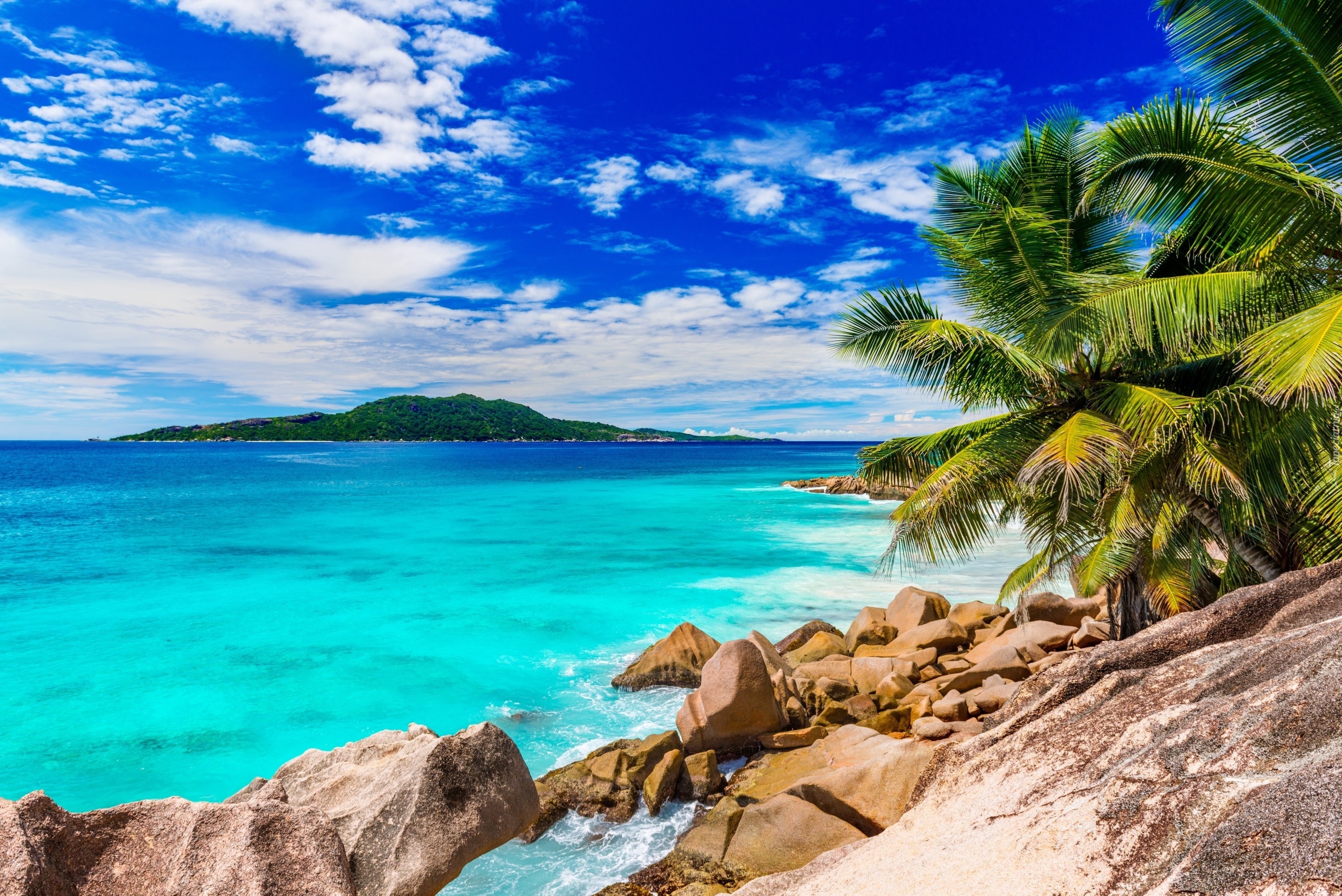 Edytor tapety: Palmy nad kamienistym brzegiem morza
