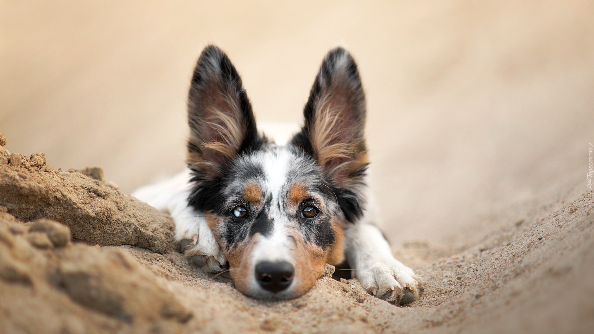 Edytor tapety: Border collie leżący na piasku