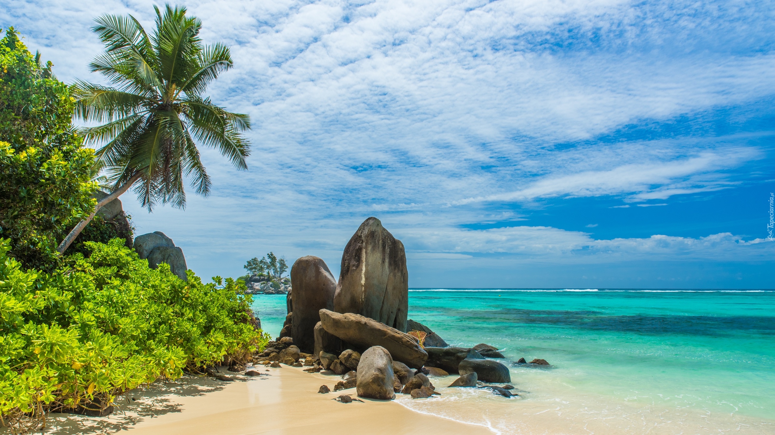 Edytor tapety: Palmy przy kamieniach nad brzegiem morza