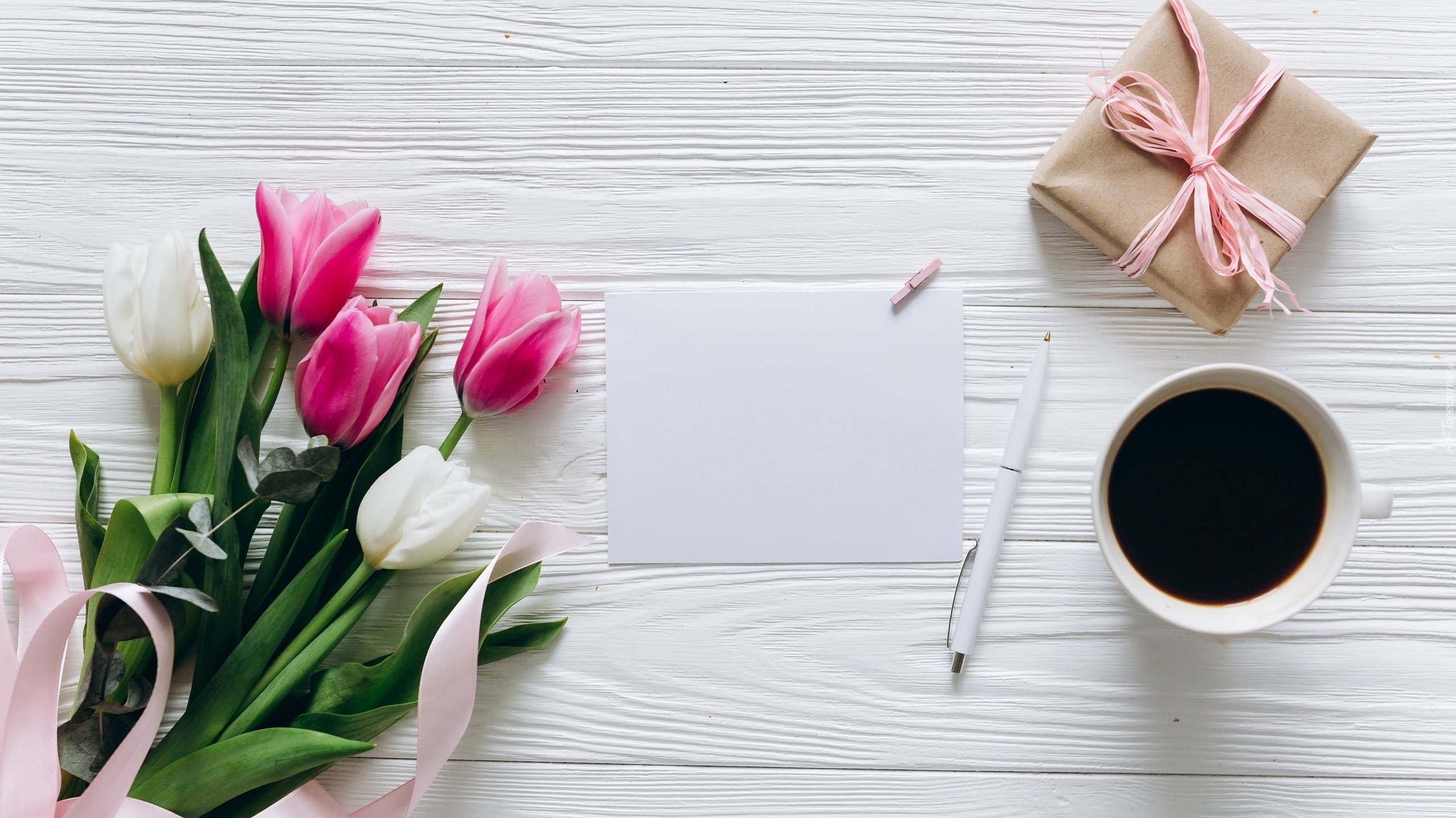Edytor tapety: Bukiet tulipanów obok kartki i filiżanki z kawą