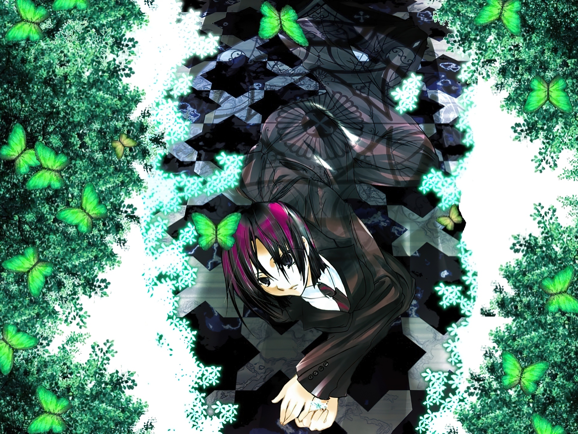 Edytor tapety: Fate Stay Night, ogród, postać, motyle, krzewy