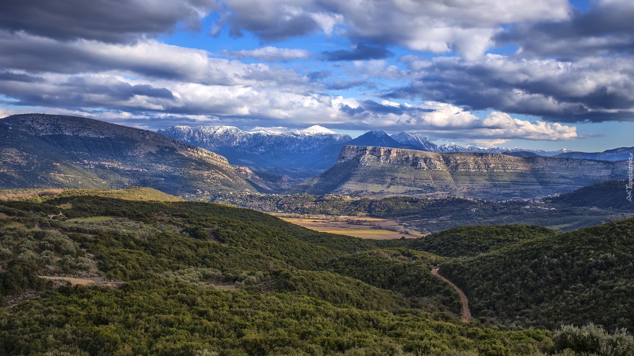 Edytor tapety: Zalesione wzgórza z widokiem na góry