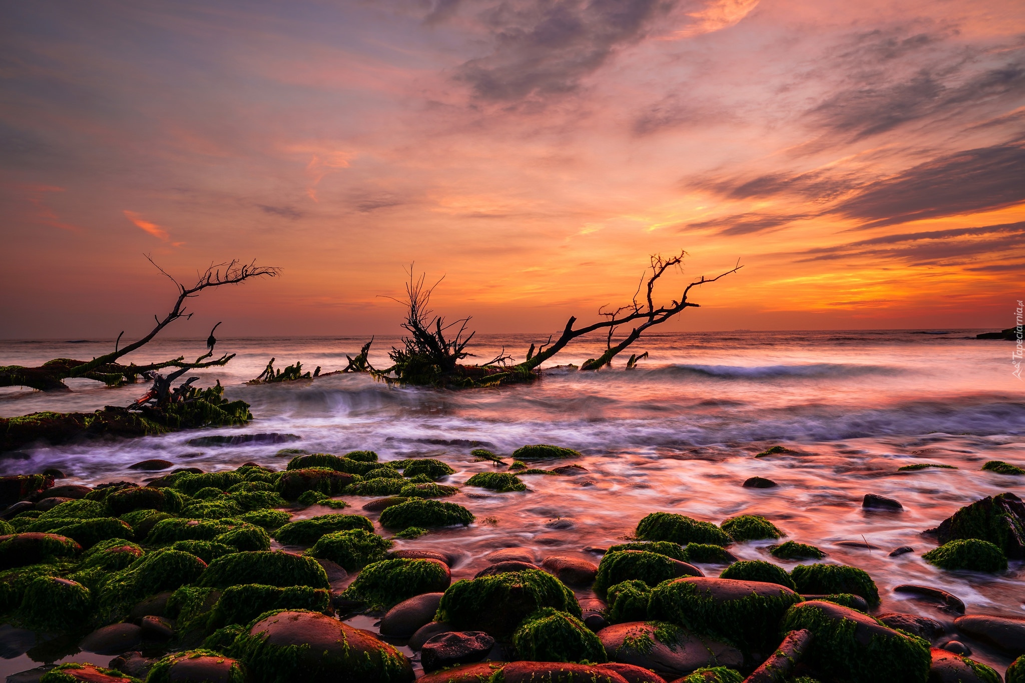 Edytor tapety: Konary drzew i glony na kamieniach w morzu