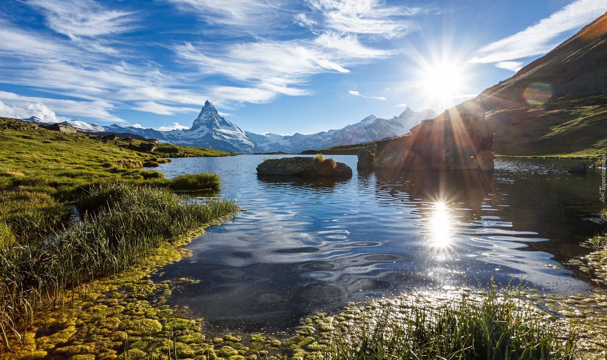Edytor tapety: Jezioro Stellise i szczyt Matterhorn w promieniach słońca