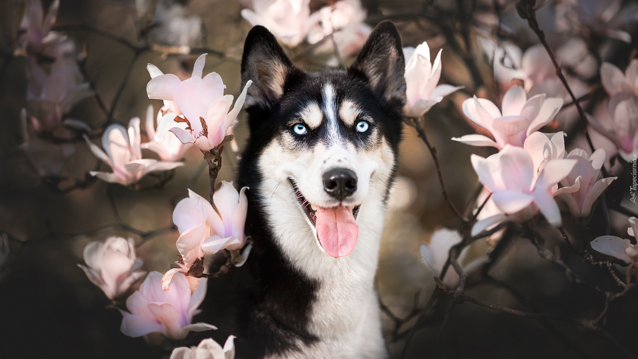 Edytor tapety: Siberian husky w kwiatach magnolii