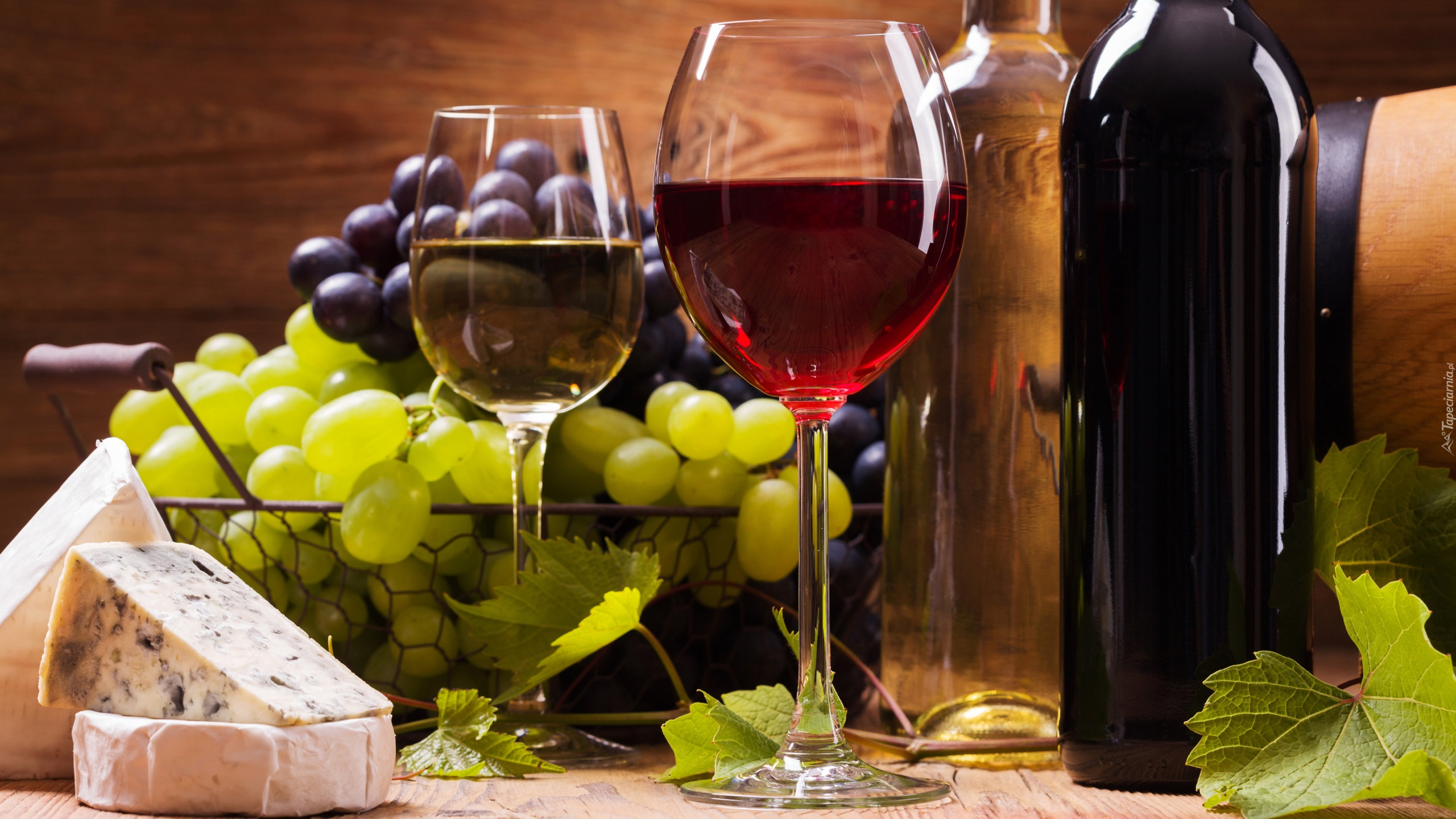 Edytor tapety: Kieliszki z winem obok kiści winogron i sera