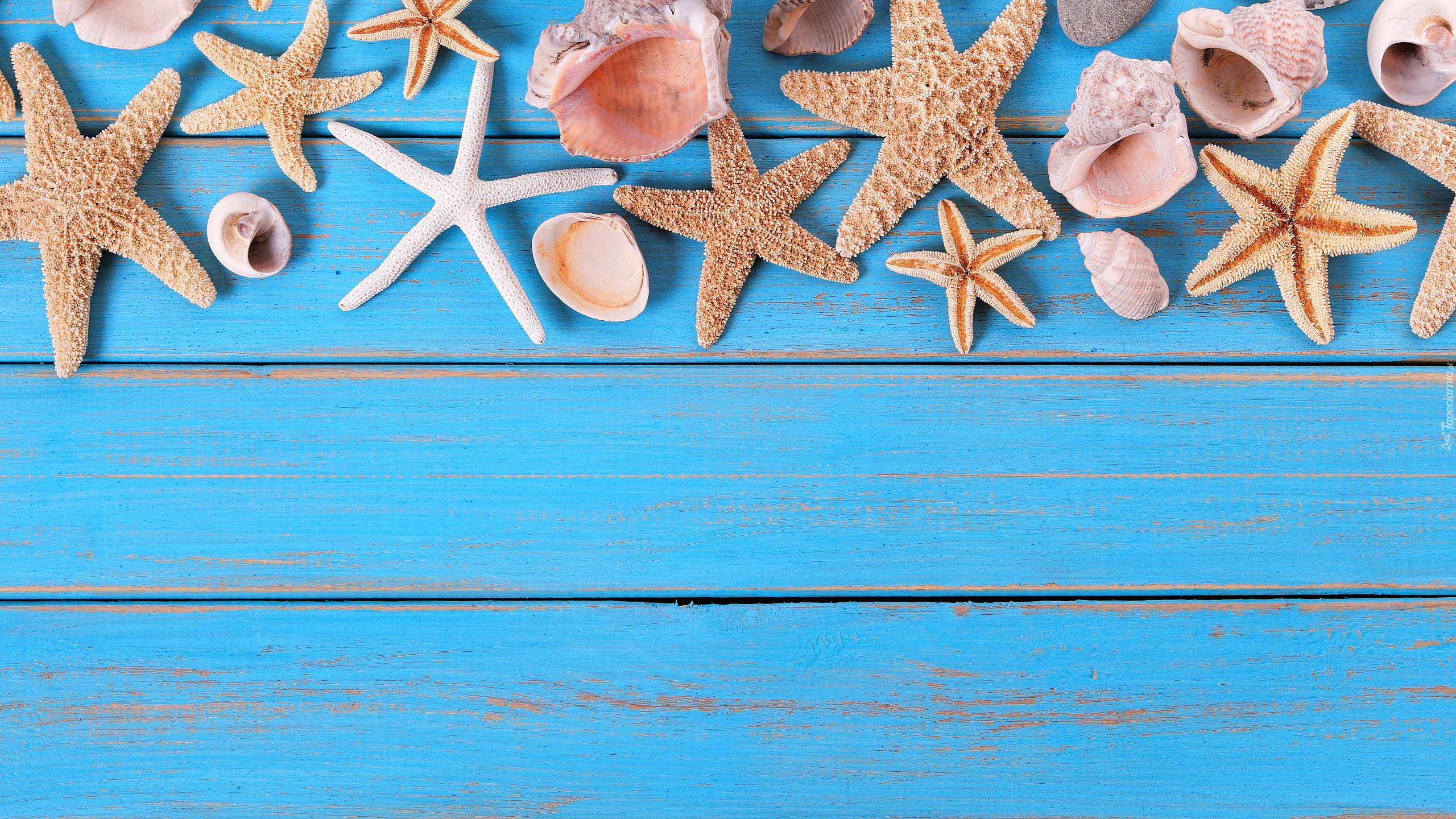 Edytor tapety: Muszelki i rozgwiazdy na niebieskich deskach